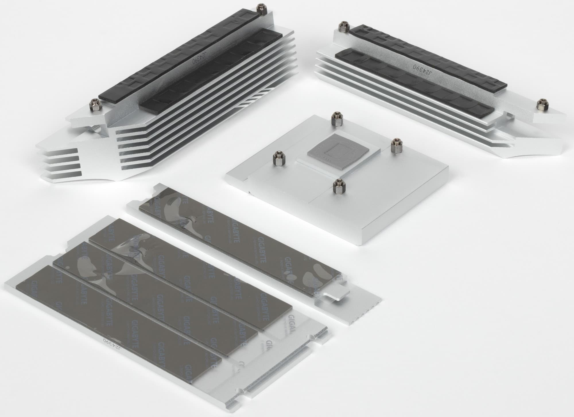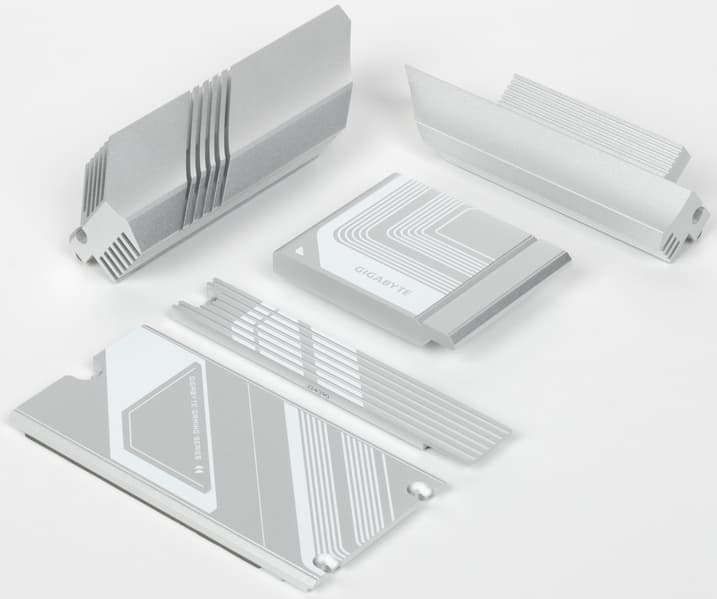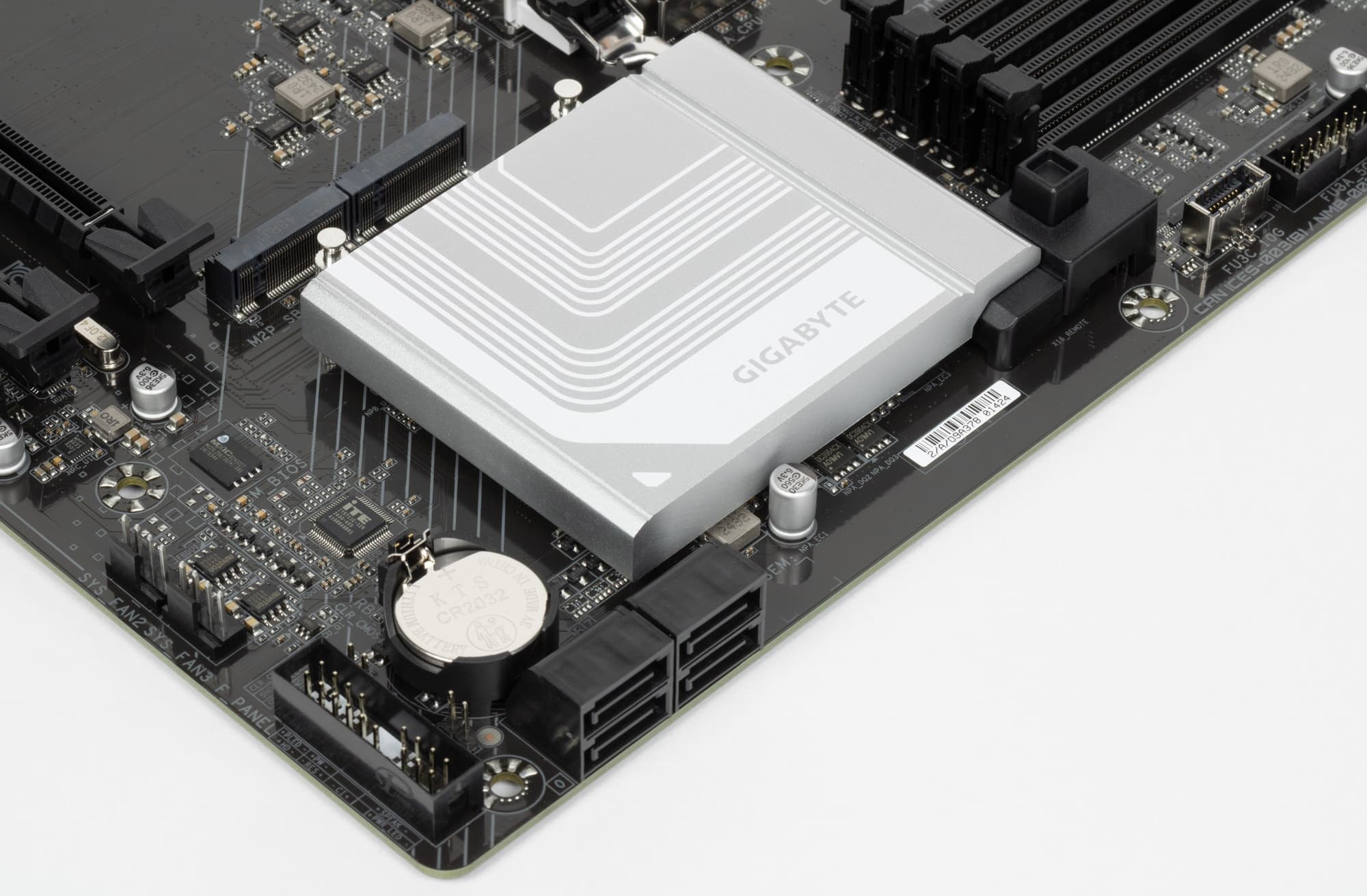 Все M.2 слоты имеют радиаторы. Верхний M2A_CPU обладает отдельным радиатором, когда как остальные все слоты M.2 имеют общий радиатор.