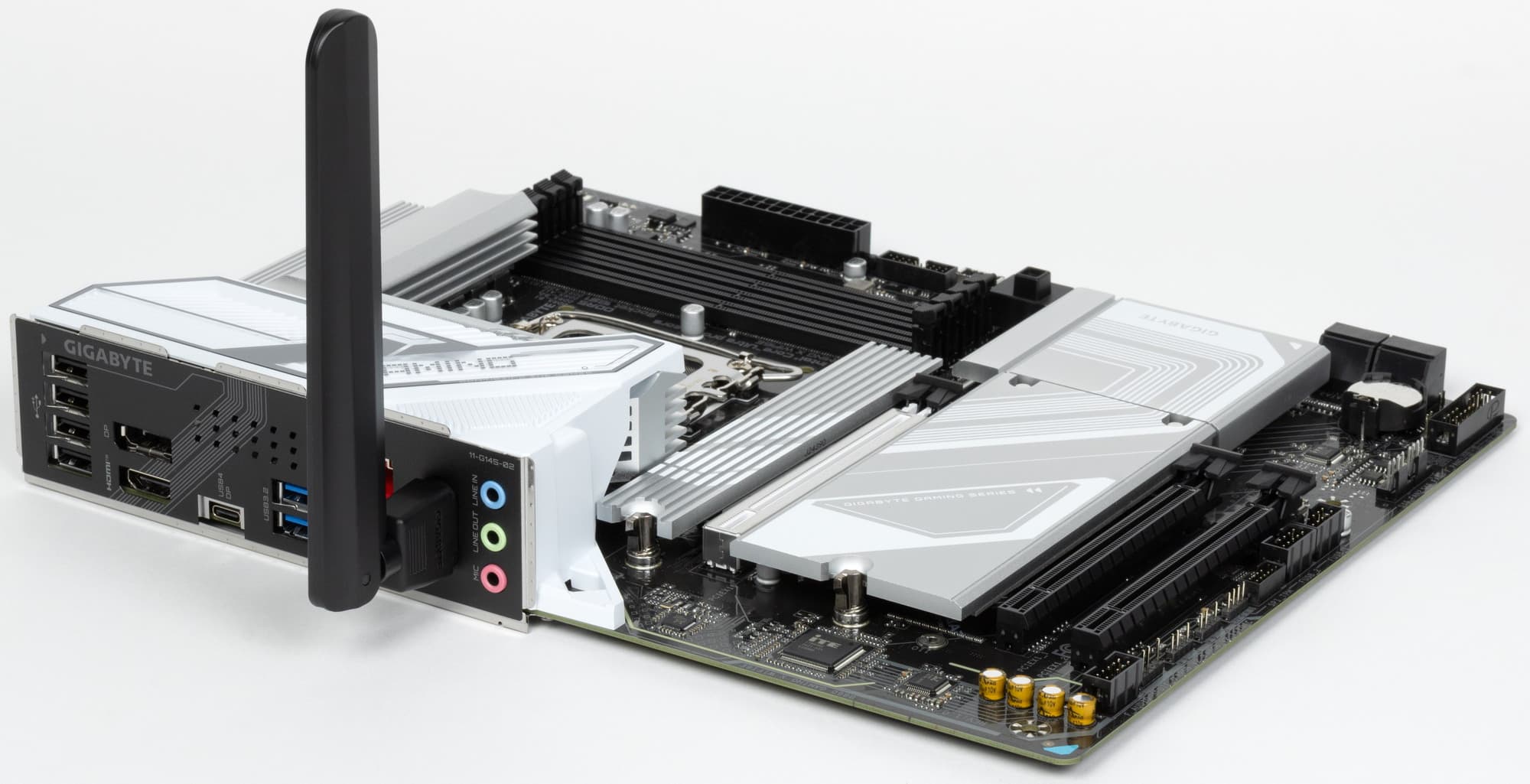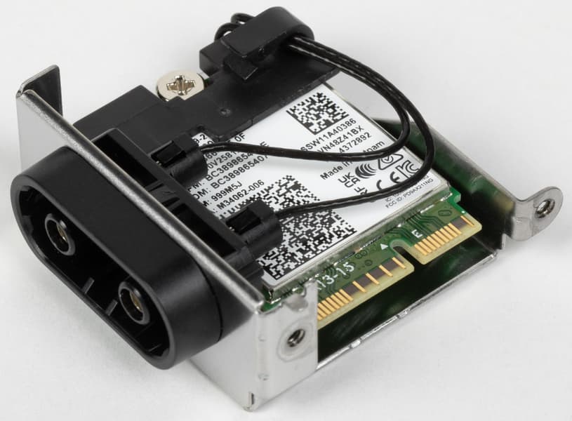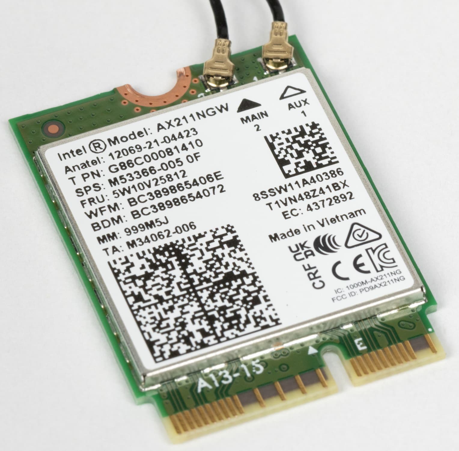 Имеется и комплексный беспроводной адаптер на контроллере Intel AX211, через который реализованы Wi-Fi 6E (802.11a/b/g/n/ac/ax, 2,4/5 ГГц) и Bluetooth 5.3. Он установлен в слот M.2 (E-key), и его разъемы для выносных антенн выведены на заднюю панель.