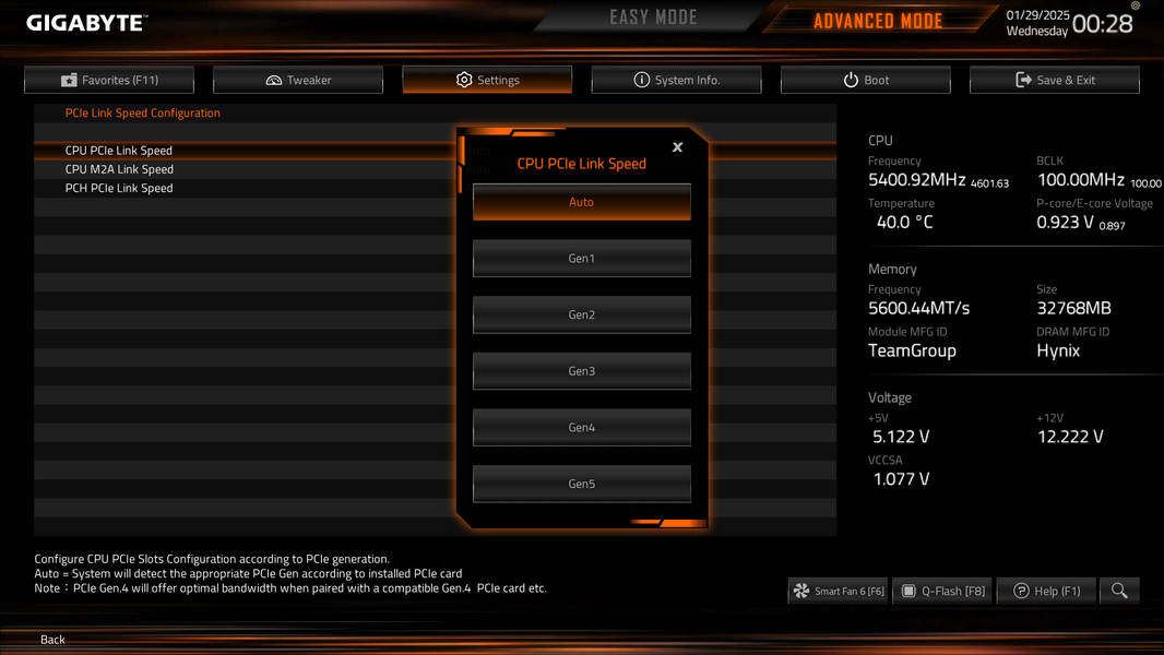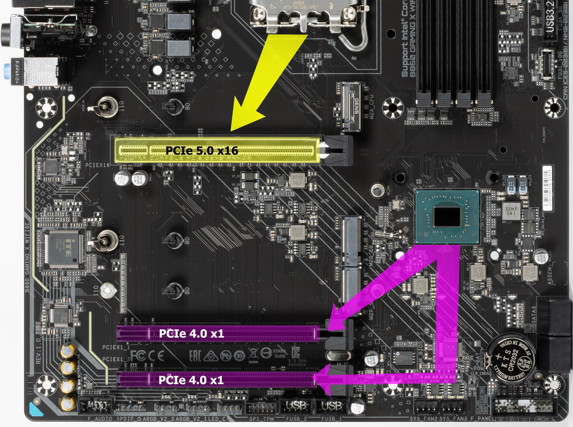 Теперь посмотрим выше на то, как работают процессоры в данной конфигурации. У CPU Core Ultra 2xx на матплатах на базе B860 всего задействовано 20 линий PCIe, из них 4 линии версии PCIe 5.0 отведены на порт М.2 (M2A_CPU) . Оставшиеся 16 линий PCIe 5.0 идут на слот PCIe x16_1. Так что вариантов переключения линий PCIe 5.0 между слотами нет.