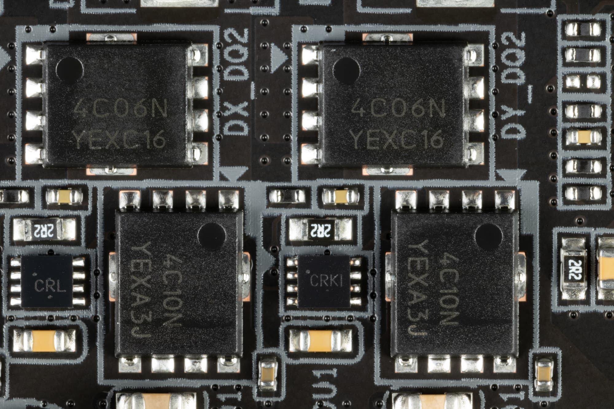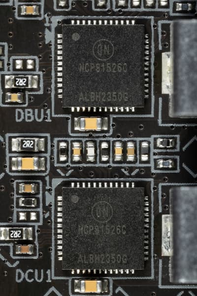 Каждый канал фазы VCore и VCCSA имеет суперферритовый дроссель и набор полевых МОП-транзисторов NTNFS4C06-4C10 от On Semi на 69 А.