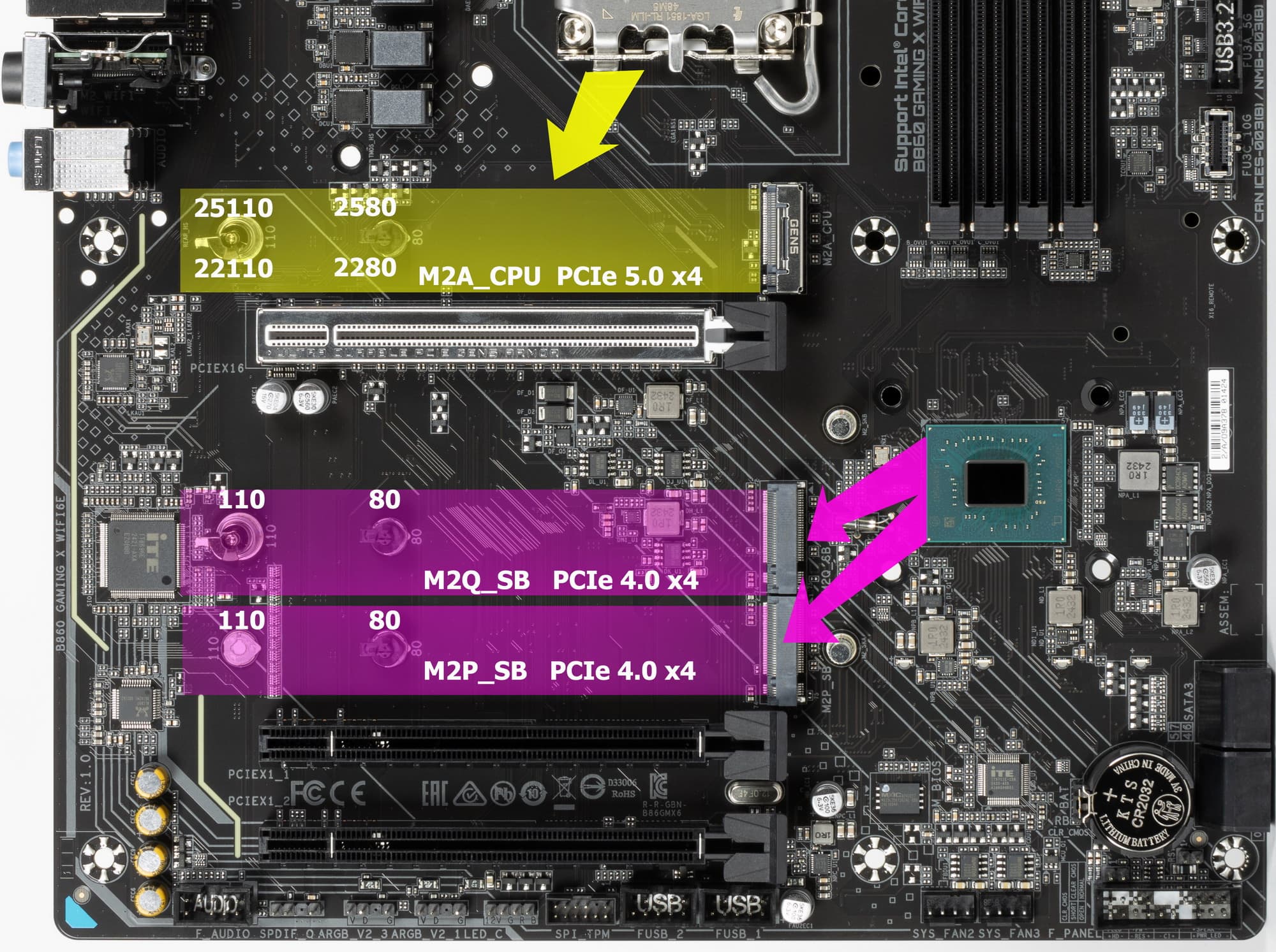 Второй и третий слоты M.2 (M2P_SB, M2Q_SB) получают данные от чипсета B860 (PCIe 4.0), а первый M2A_CPU — от CPU ( PCIe 5.0).