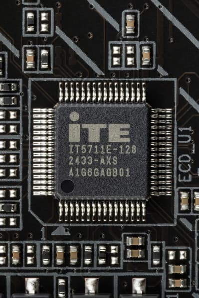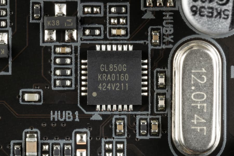 - 9 портов USB 2.0/1.1: 4 реализованы через контроллер Genesys Logic GL850G (он расположен под слотом PCIe x16_3, поэтому его почти не видно, на него потрачена 1 линия USB 2.0 от B860) и представлены двумя внутренними разъемами (каждый на 2 порта); еще 4 реализованы через второй контроллер Genesys Logic GL850G (на него также потрачена 1 линия USB 2.0 от B860) и еще один реализован через B860: все пять представлены на задней панели портами Type-A;