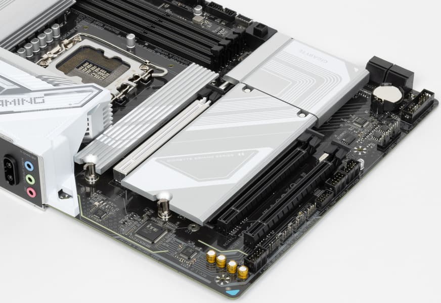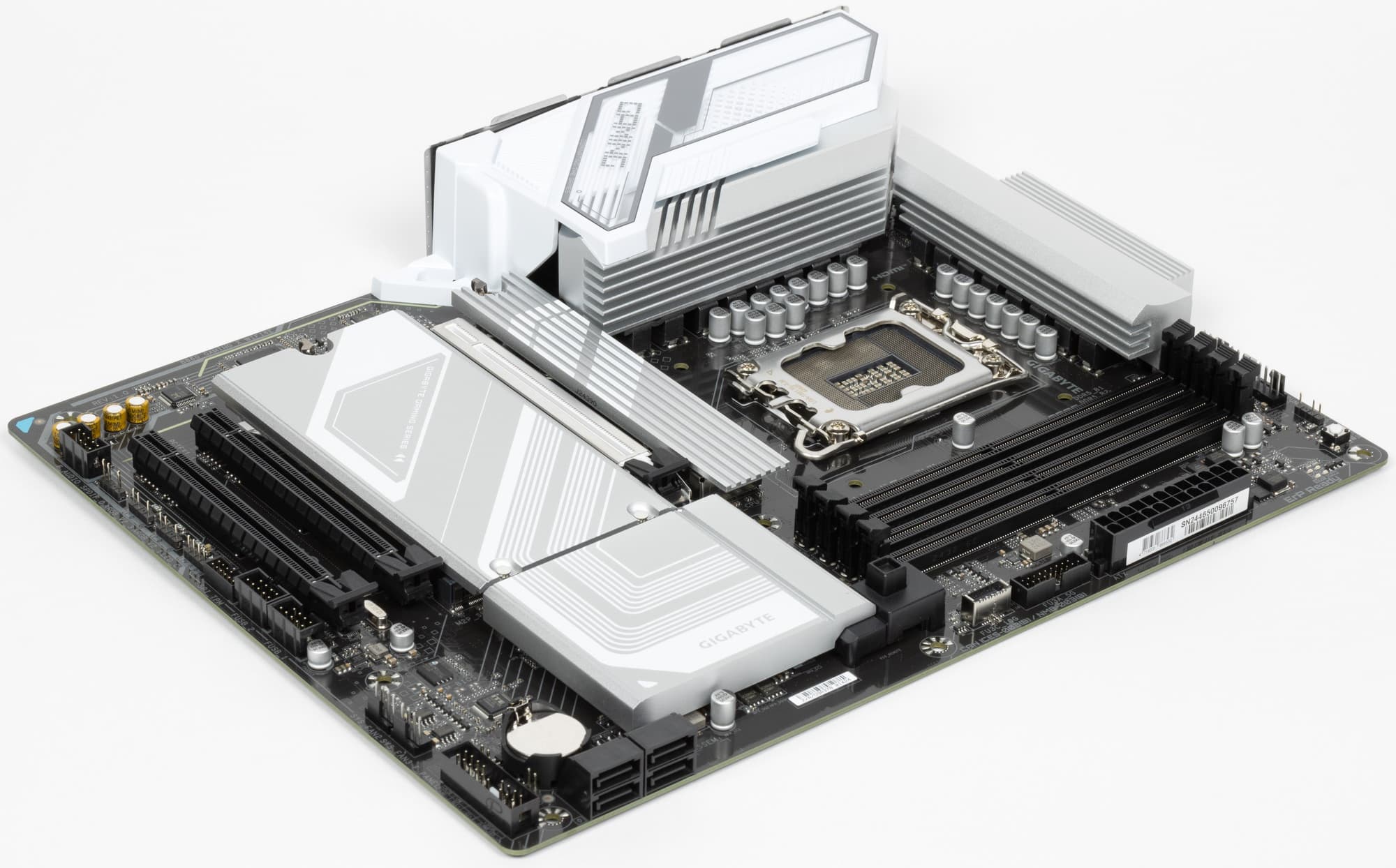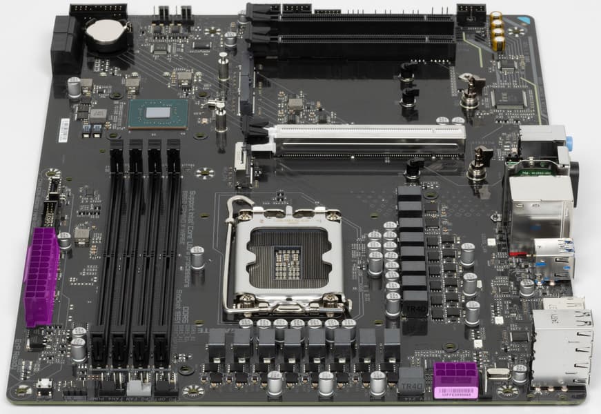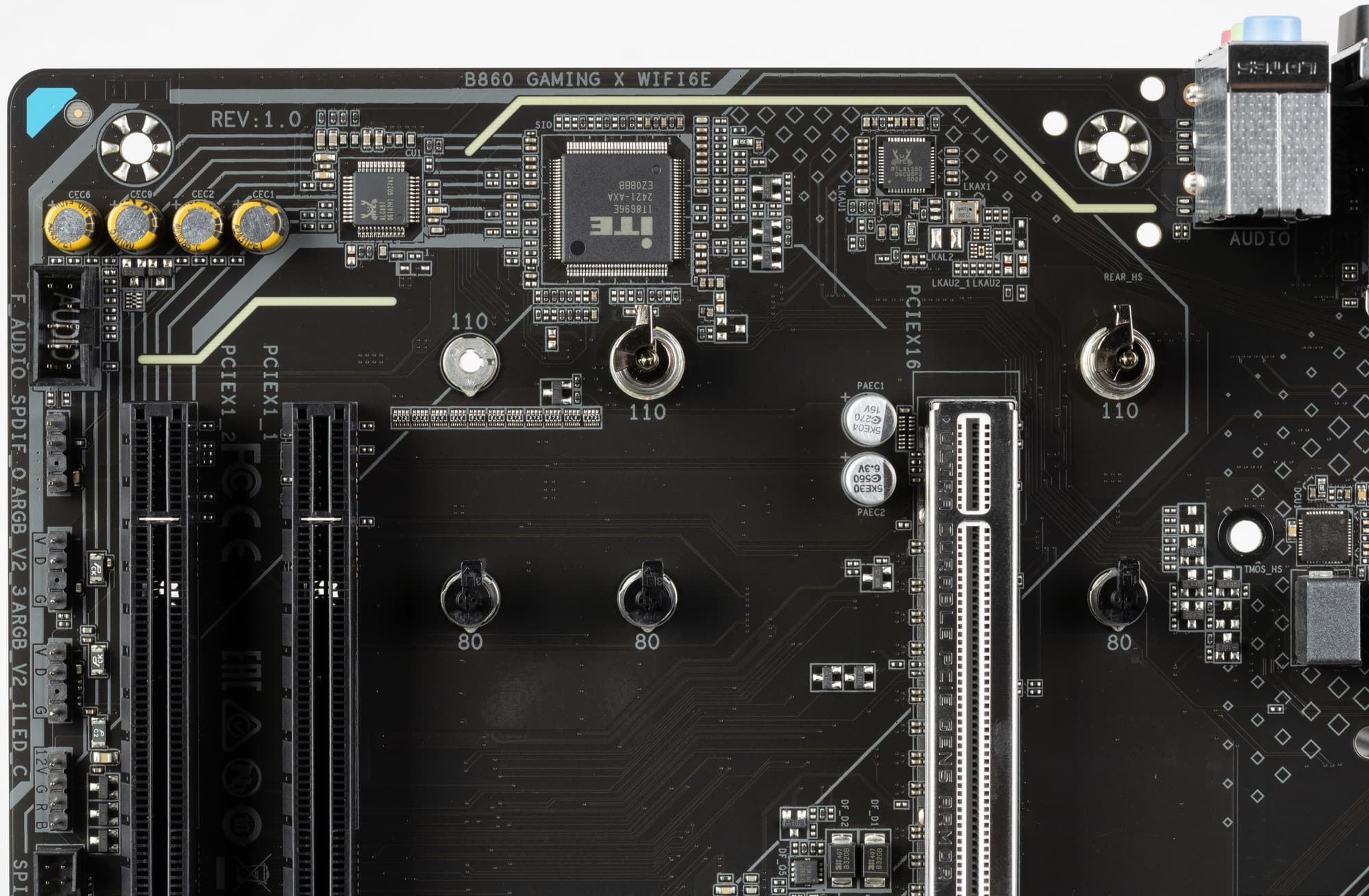 У нее 16 портов USB разных видов, включая 1 USB4, 2 USB 3.2 Gen2 (в виде внутреннего порта Type-C и порта Type-A) и 4 USB 3.2 Gen1. Также плата предлагает слот PCIe х16, получающий от процессора 16 линий PCIe 5.0, и два «длинных» слота PCIe x1, подключенных к чипсету. Из 3 слотов M.2 один подключен напрямую к процессору линиями PCIe 5.0, а два других — к чипсету B860 линиями PCIe 4.0.