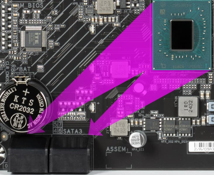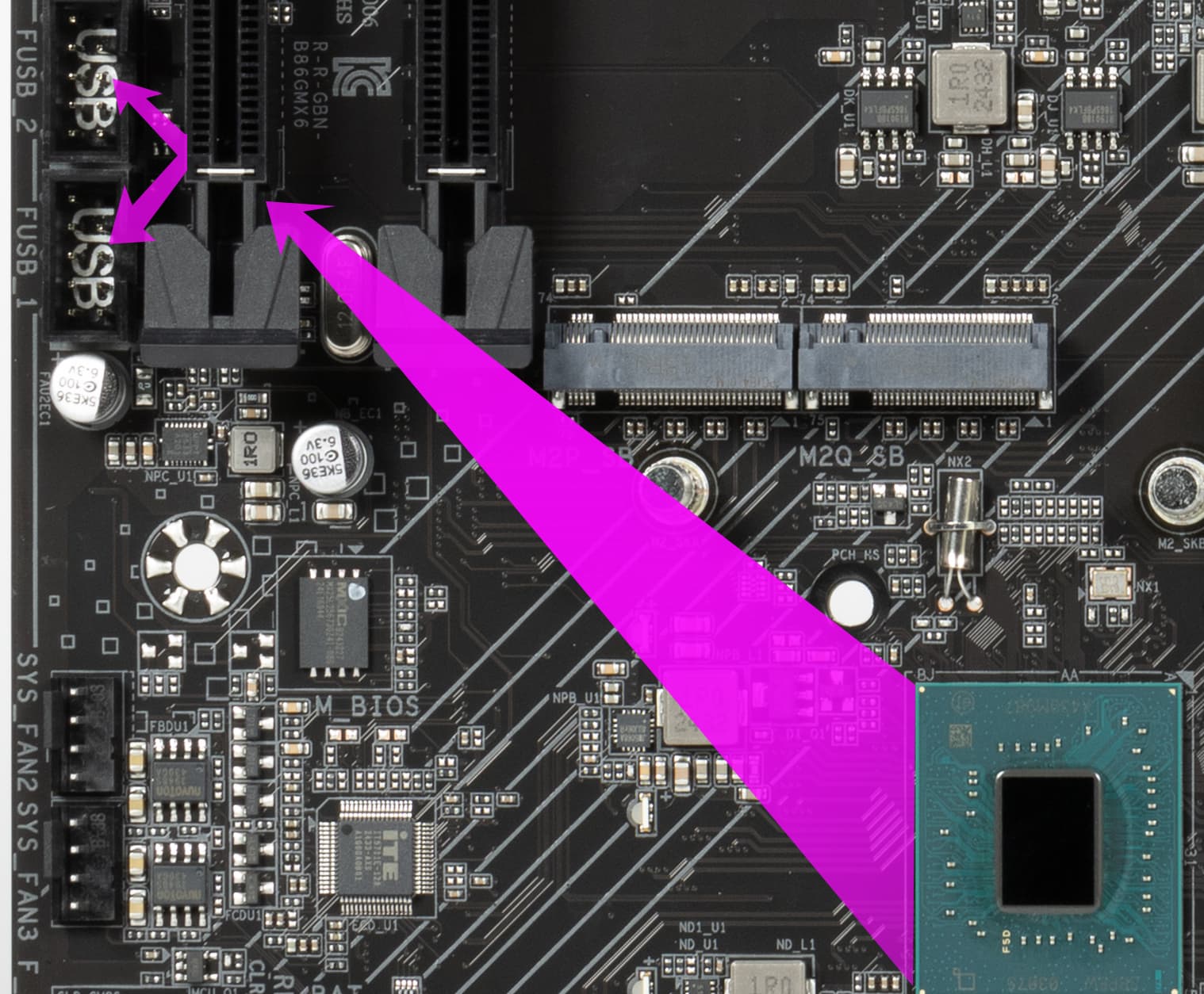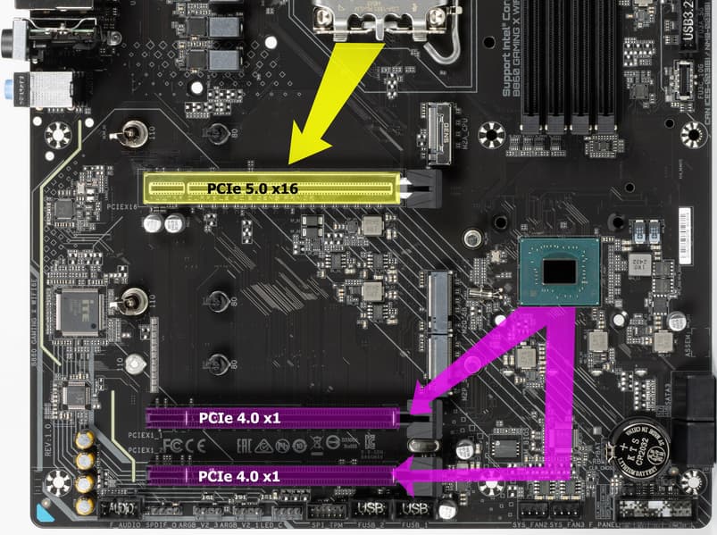 Кроме USB-портов, к которым мы подойдем позже, чипсет B860 обладает 14 PCIe линиями PCIe 4.0 и 4 SATA портами. Считаем, сколько линий B860 уходит на поддержку (связь) с тем или иным элементом: