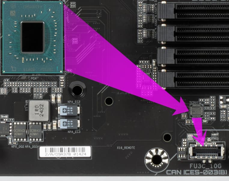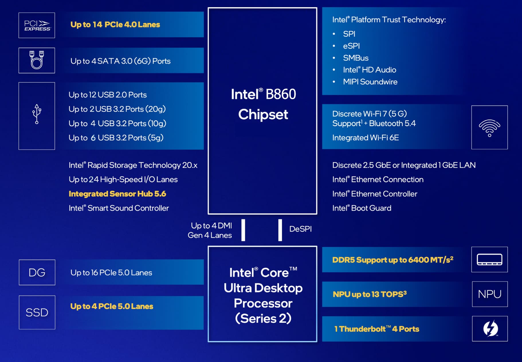 При этом взаимодействие с B860 идет по особому каналу Digital Media Interface 4.0 (DMI 4.0 x4). Serial Peripheral Interface (SPI) используется для взаимодействия с системой UEFI/BIOS, а шина Low Pin Count (LPC) — для связи с устройствами ввода/вывода, не требующими высокой пропускной способности (контроллерами вентиляторов, TPM, старой периферии). HDA более не используется, связь с аудиокодеками идет с помощью линий USB 2.0.