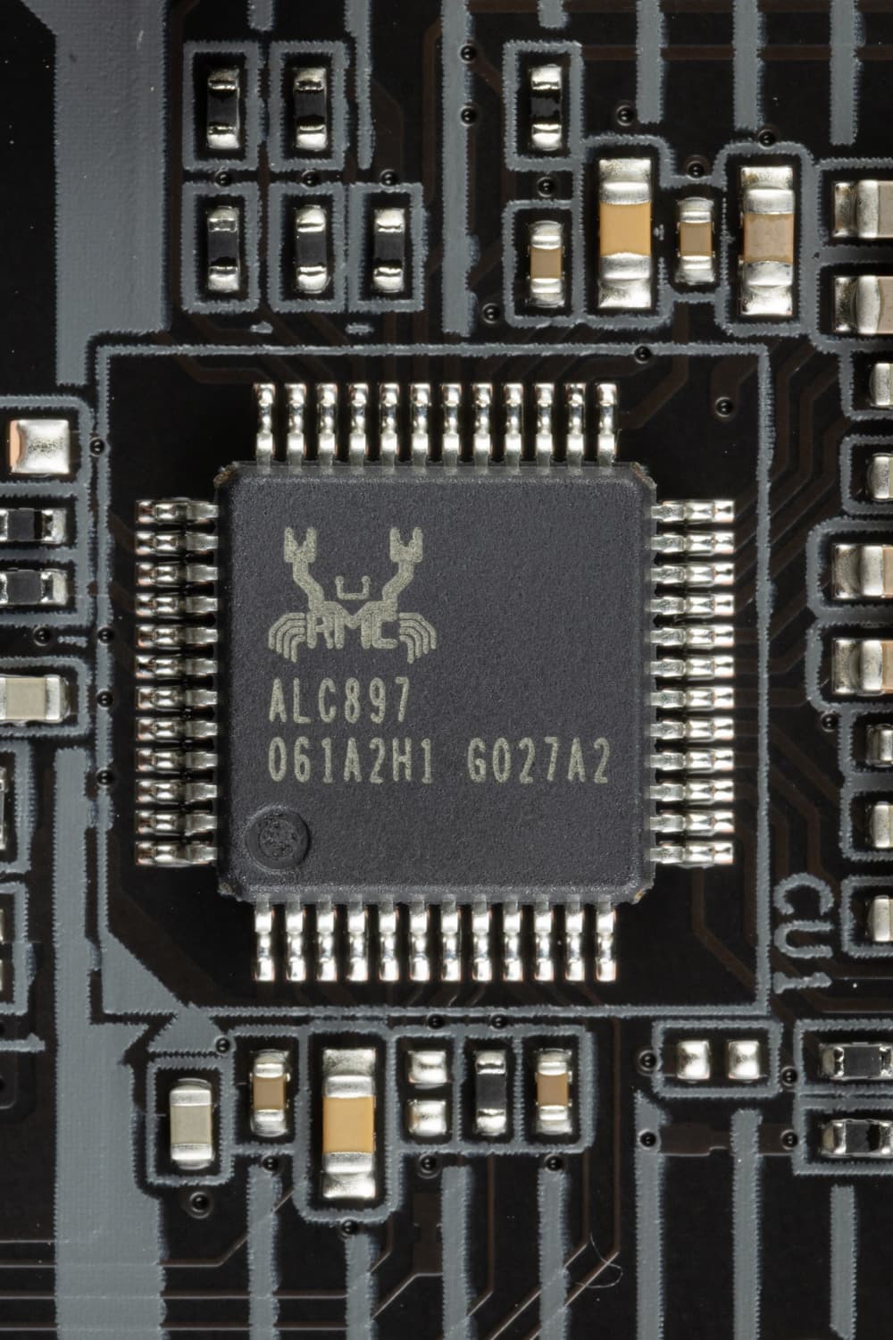 В данном случае плата оснащена аудиоподсистемой, где звуком заведует аудиокодек Realtek ALC897, он целом обеспечивает вывод звука по схемам до 7.1 с разрешением до 24 бит /192 кГц. Не забываем, что для работы такого кодека требуются сигнальные линии USB 2.0.