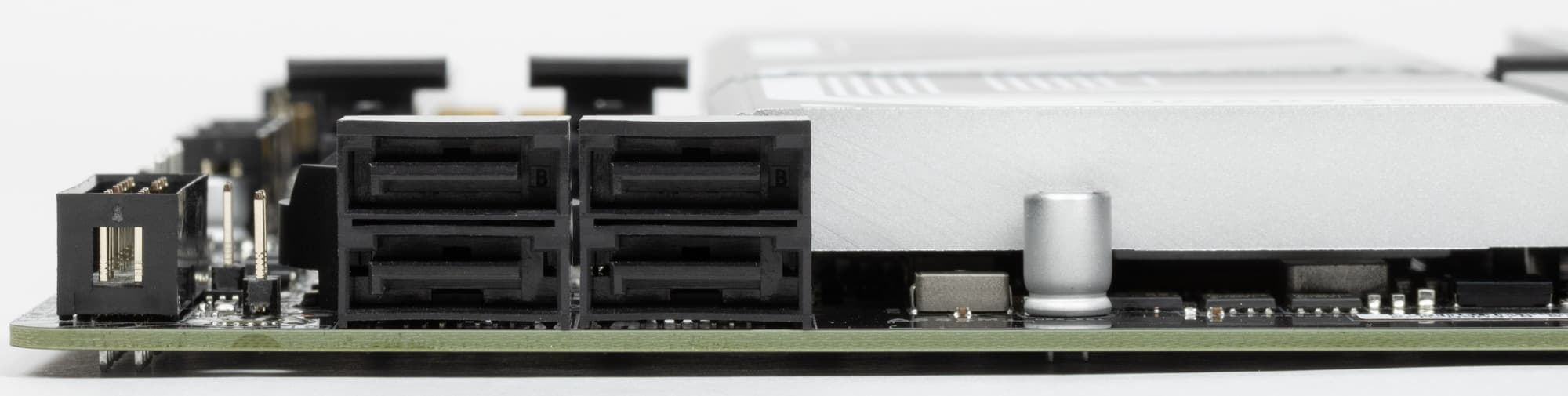 Всего у платы 4 разъема Serial ATA 6 Гбит/с +3 слота для накопителей в форм-факторе M.2. 4 порта SATA 4,5,6,7 реализованы через чипсет B860 и поддерживают создание RAID.