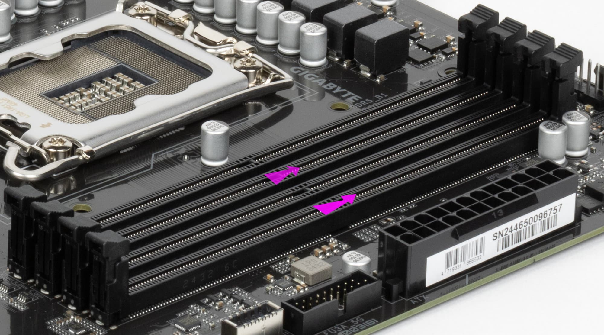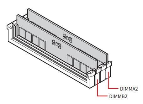 Для установки модулей памяти на плате Gigabyte имеется четыре DIMM-слота (для работы памяти в Dual Channel в случае использования всего 2 модулей их следует устанавливать в А2 и B2.
