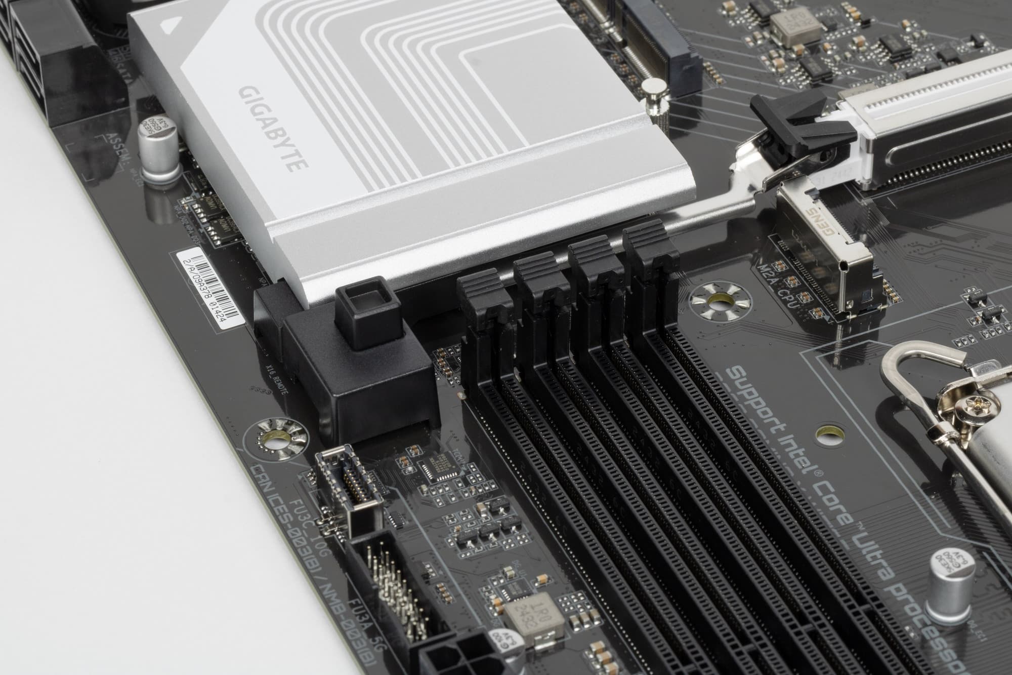 Плата поддерживает небуферизованную память DDR5 (non-EСС), а максимальный объем памяти составляет 256 ГБ. Могут использоваться модули CUDIMM.