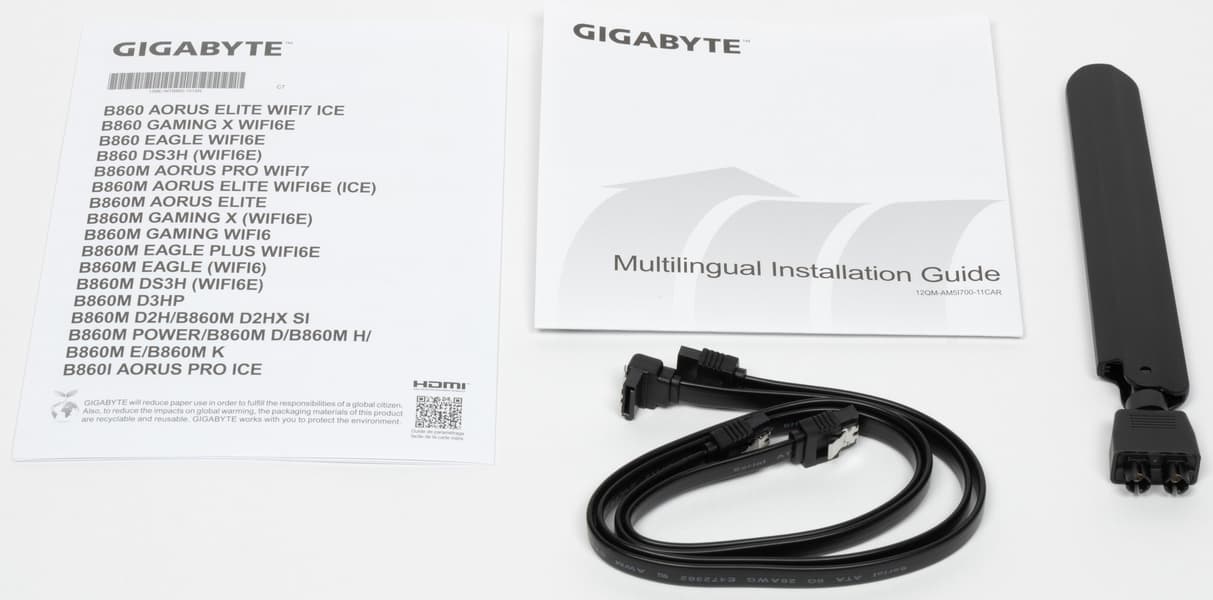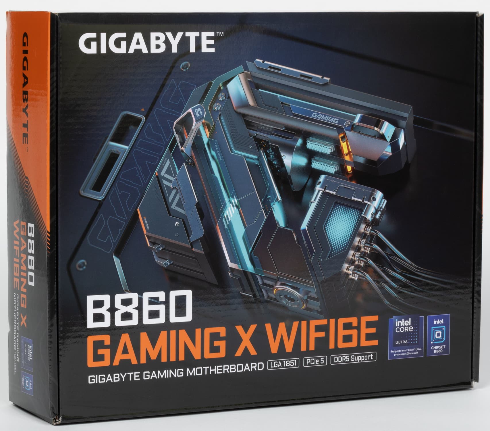 Gigabyte B860 Gaming X WiFi 6E поставляется в коробке стандартного дизайна Gigabyte. Комплект размещен под платой в отдельном отсеке.