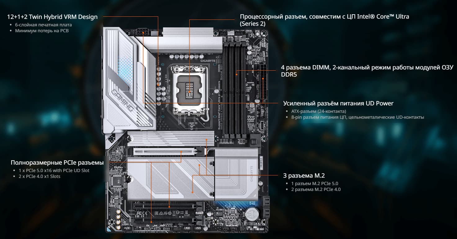 | Память | 4 × DDR5, до 9066 МТ/с (XMP), до 256 ГБ, два канала (DIMM/CUDIMM) |