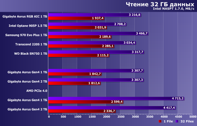 Почему важна емкость? Потому, что в первую очередь преимущества нового интерфейса можно «увидеть» именно при обработке больших объемов данных. Несложно заметить, что при работе через PCIe 3.0 x4 Aorus NVMe Gen4 SSD справляются с чтением и записью на уровне других твердотельных накопителей — но на PCIe 4.0 убедительно обходят всех.