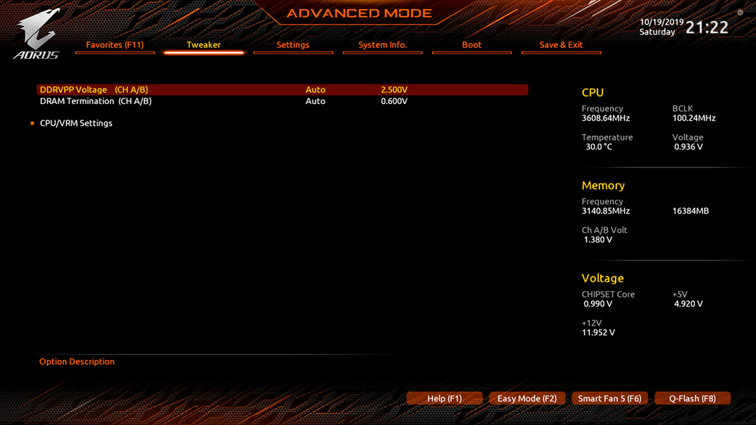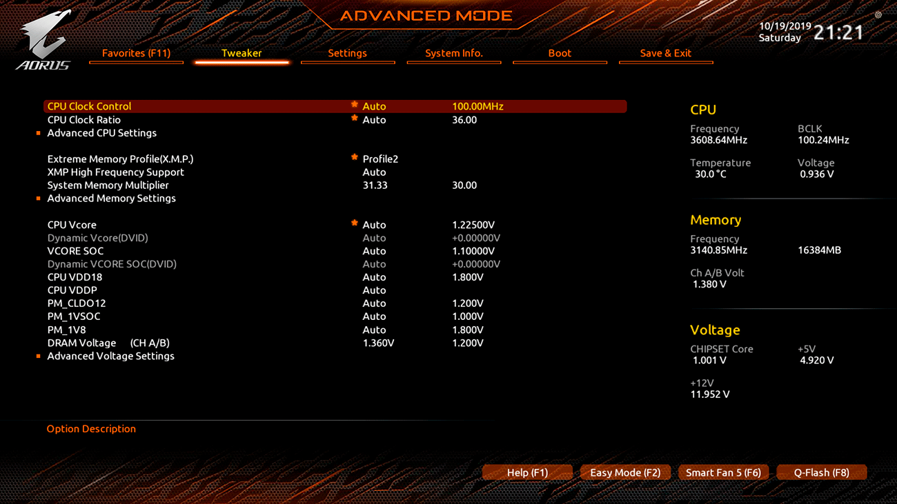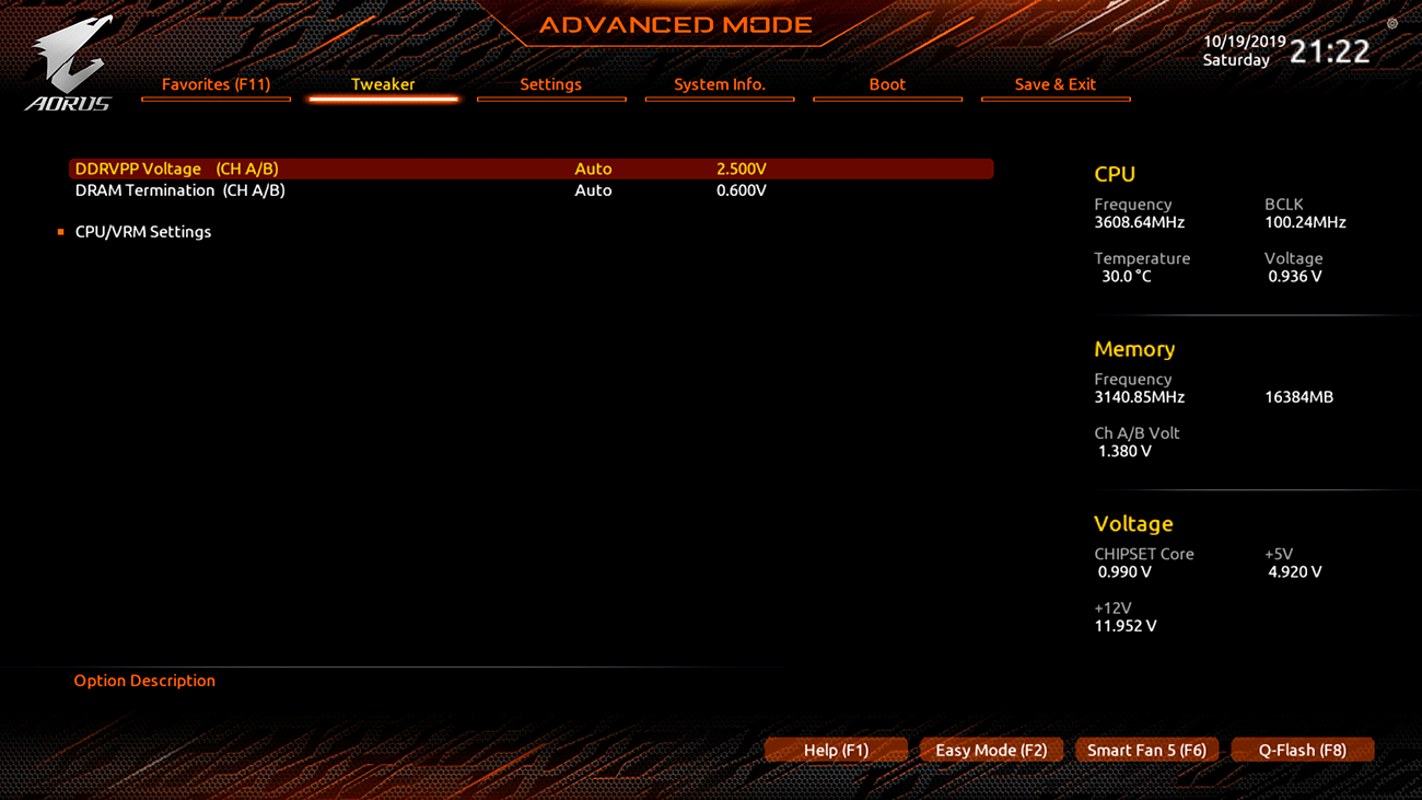 Для переключения в расширенный режим BIOS нужно нажать на F2. После этого открывается привычный интерфейс с пятью основными разделами и входящими в них параметрами, а также разделом «Избранное». В основном разделе Tweaker собраны параметры работы процессора и оперативной памяти.