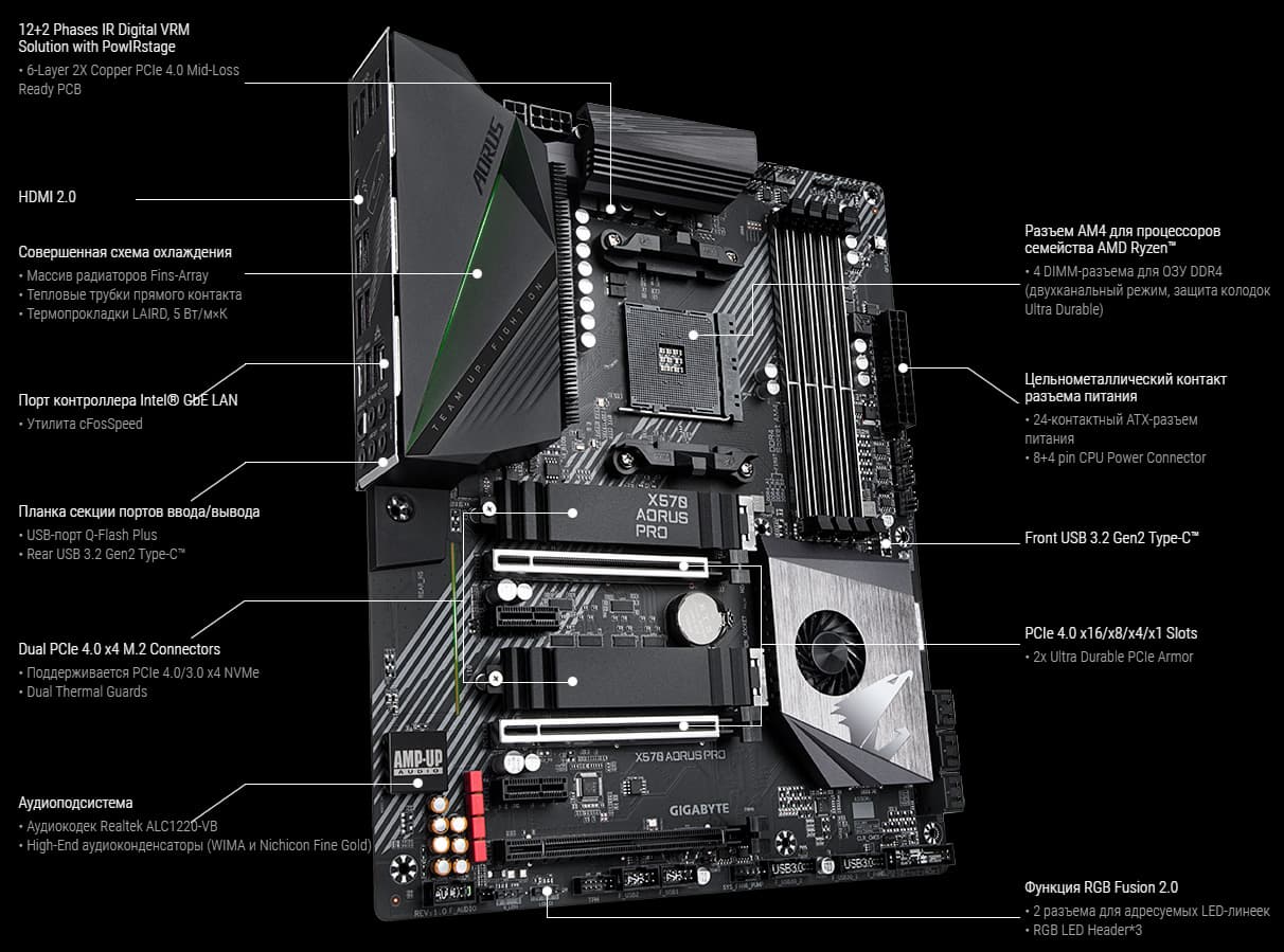 Материнская плата Gigabyte X570 Aorus Pro в серии плат компании Gigabyte на наборе системной логики AMD X570 представляет собой оптимальное сочетание характеристик и функциональных возможностей со сравнительно невысокой стоимостью. Система питания процессора способна выдержать любые существующие CPU, в том числе и при разгоне, а эффективность ее охлаждения находится на очень высоком уровне. Поддержка оперативной памяти с частотой вплоть до 4,4 ГГц и безграничные возможности по настройке таймингов в BIOS помогут настойчивым и кропотливым пользователям выжать максимум производительности из нынешней платформы AMD. Нет на данной плате Gigabyte и известной проблемы с охлаждением чипсета — радиатор с вентилятором справляются со своей задачей без лишнего шума.