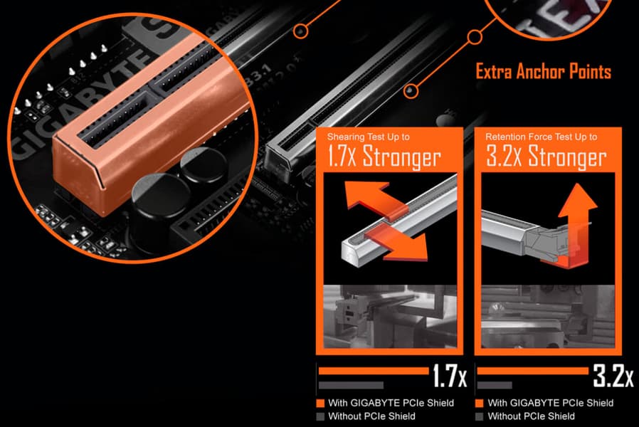 Второй слот PCI Express x16 здесь уже только версии 3.0 и может работать в режиме x8, но оба облачены в алюминиевую оболочку Ultra Durable, усиливающую их на излом в 1,7 раза и в 3,2 раза на выдергивание, а также защищающую слоты от электромагнитных помех.