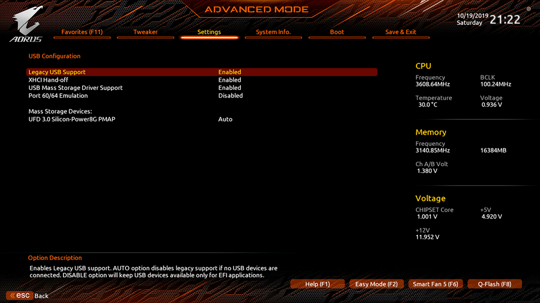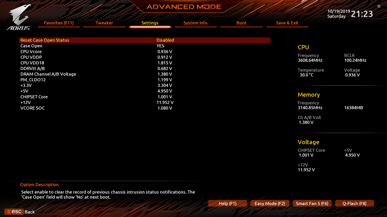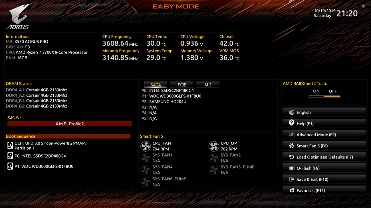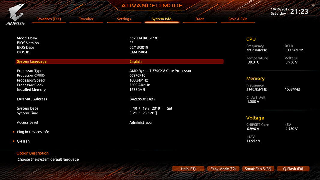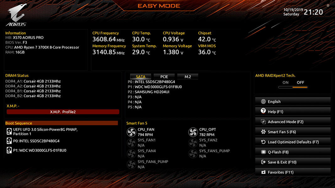 При первом запуске BIOS платы Gigabyte X570 Aorus Pro стартует в режиме Easy Mode, в котором для настроек доступны только базовые параметры и основные показатели мониторинга. Скорее, этот режим можно назвать информационным, нежели функциональным.