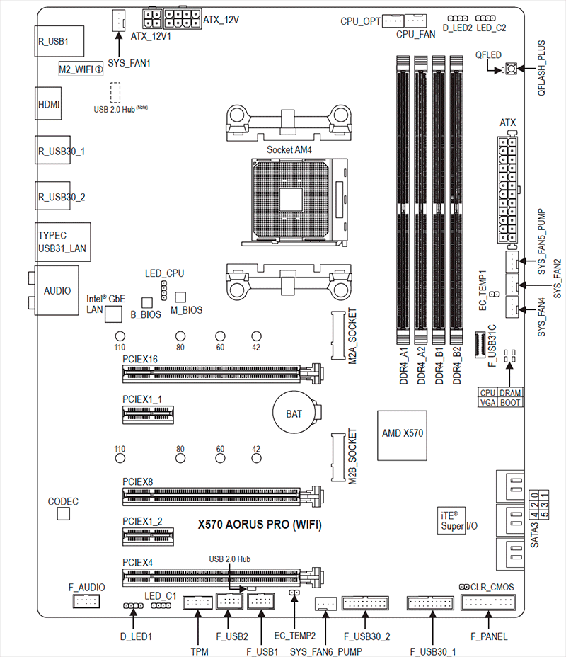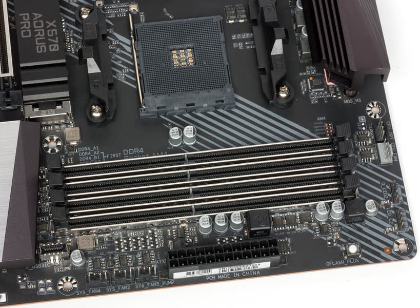 Компоновка Gigabyte X570 Aorus Pro стандартная, большая часть текстолита закрыта радиаторами и все тем же пластиковым кожухом.