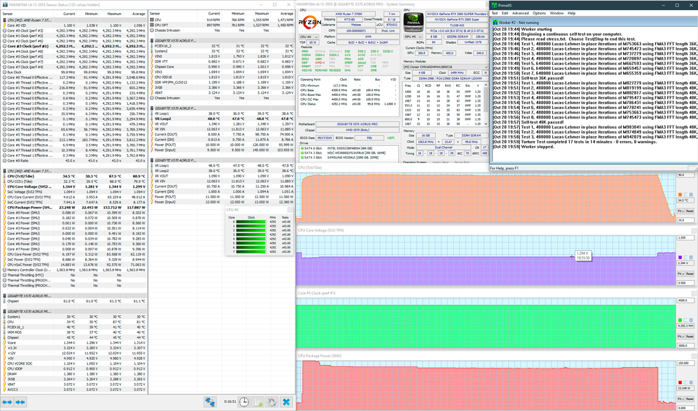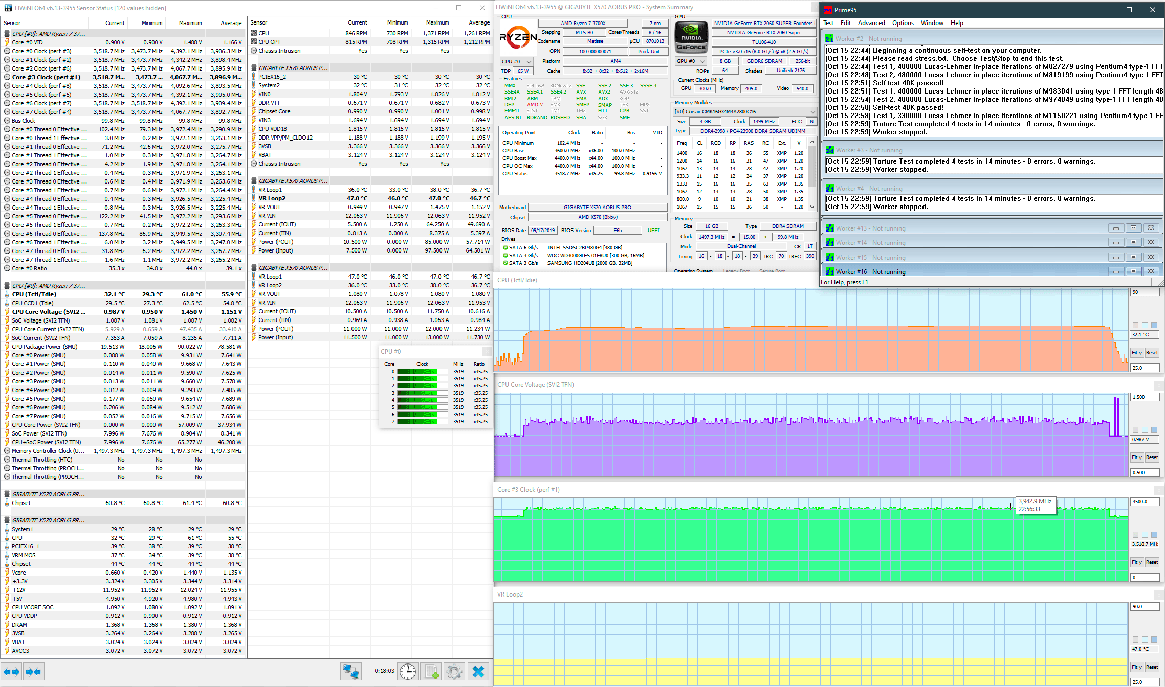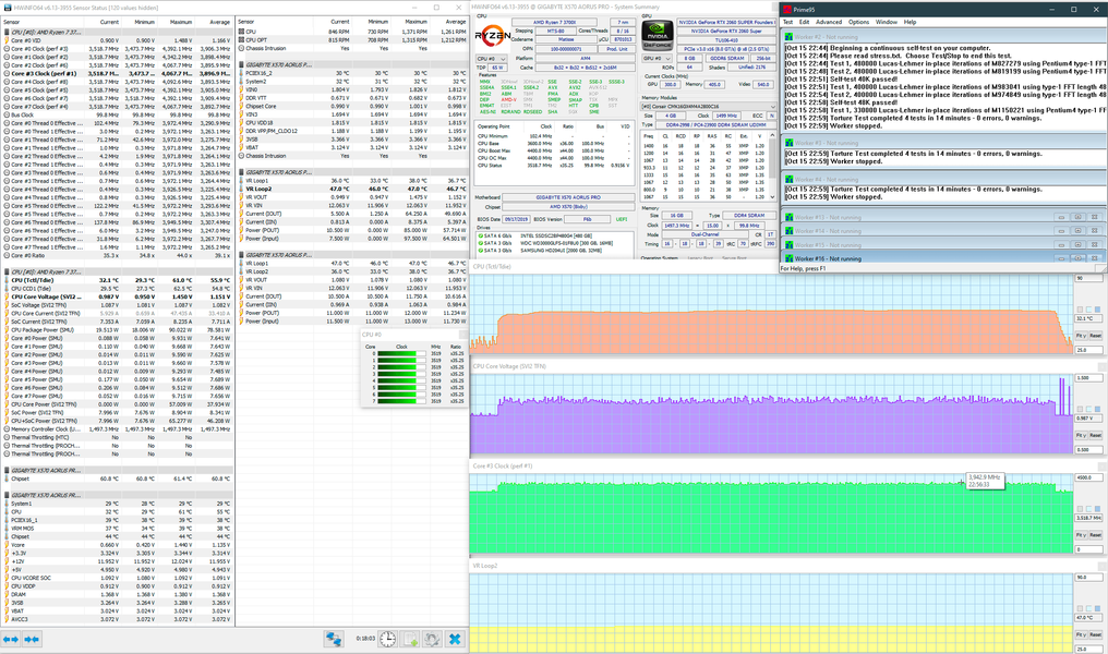 Стабильность системы в номинальном режиме и при разгоне мы проверяли стресс-утилитой Prime95 29.8 build 6 и другими бенчмарками, а мониторинг проводился с помощью HWiNFO64 версии 6.13-3955.