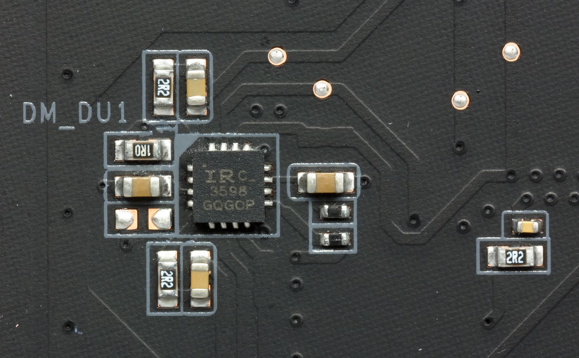 Еще одна микросхема-дублер Infineon IR3598 распаяна под зоной двух «вертикальных» фаз питания процессора (расположенных сверху над процессорным разъемом).