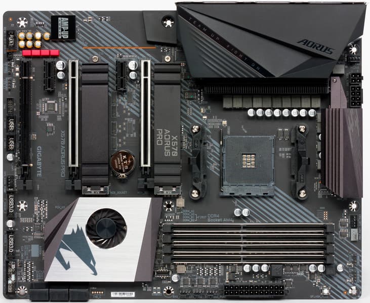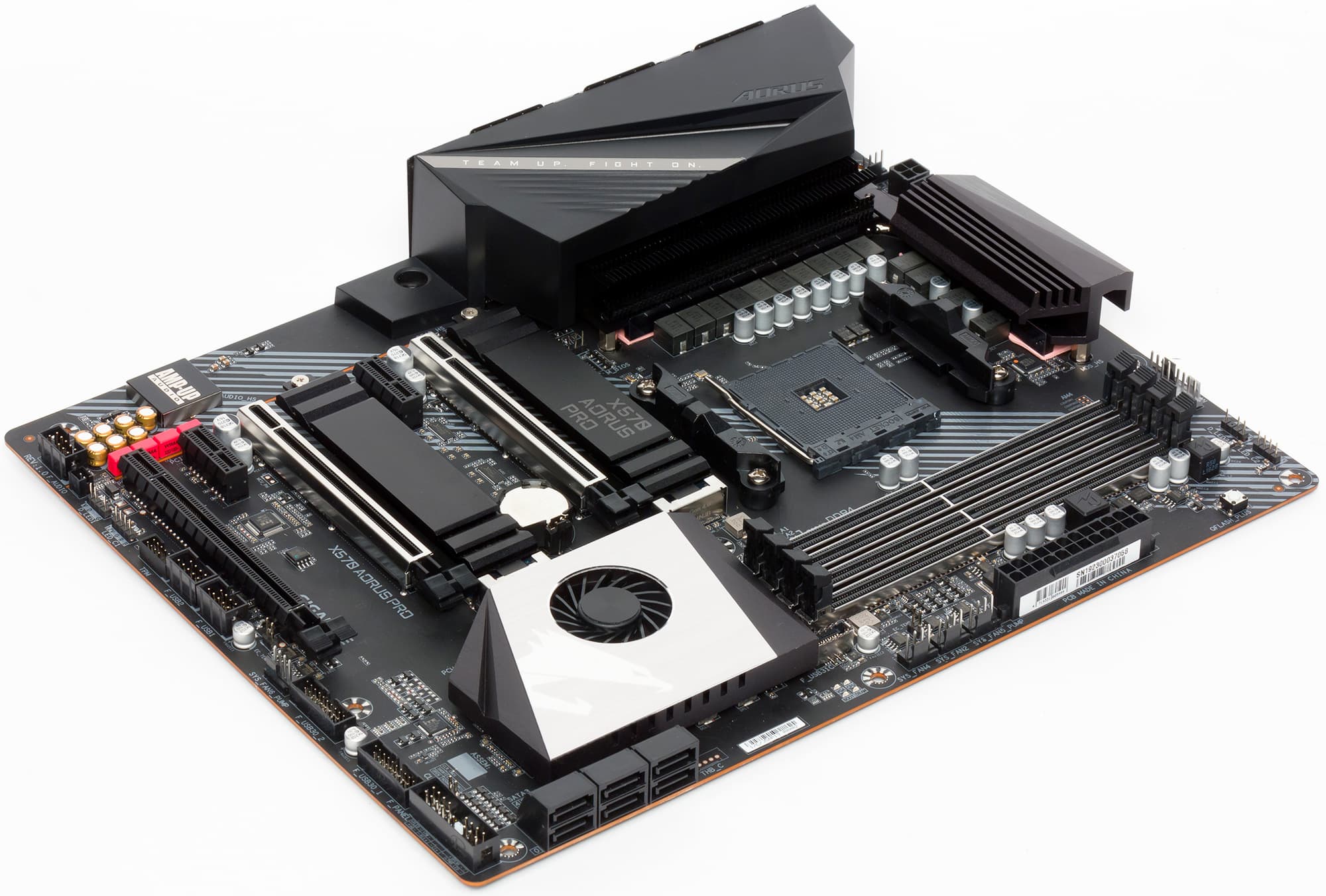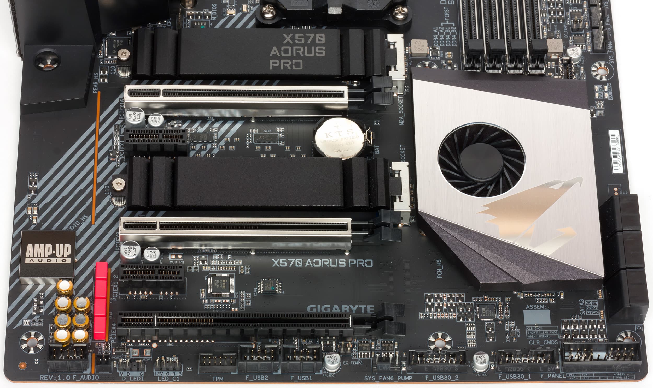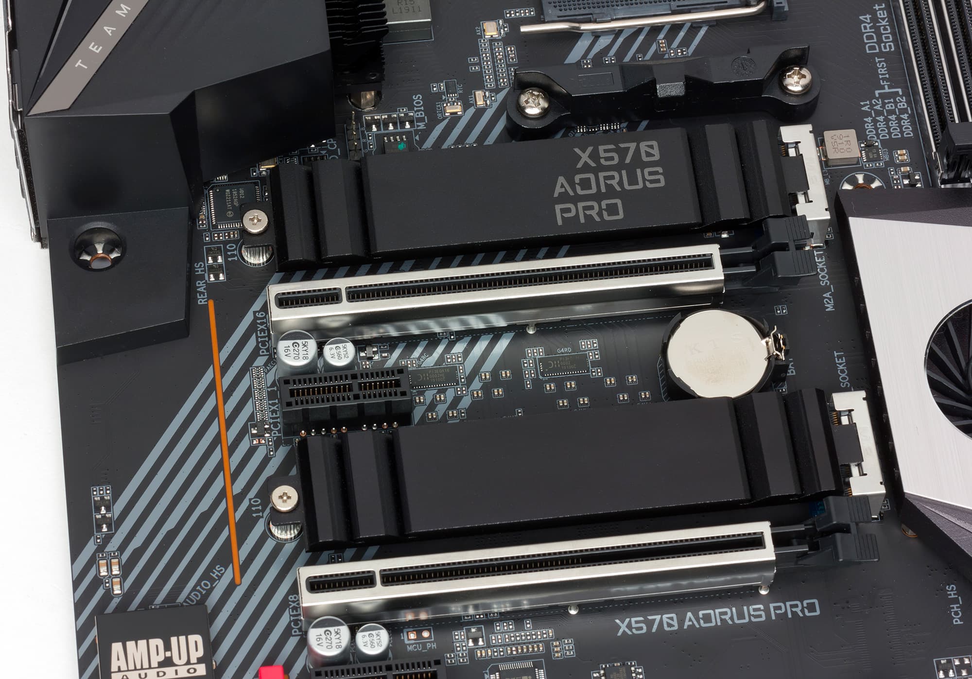 Для высокоскоростных накопителей SSD у Gigabyte X570 Aorus Pro есть два порта M.2, оснащенные массивными радиаторами с термопрокладками.