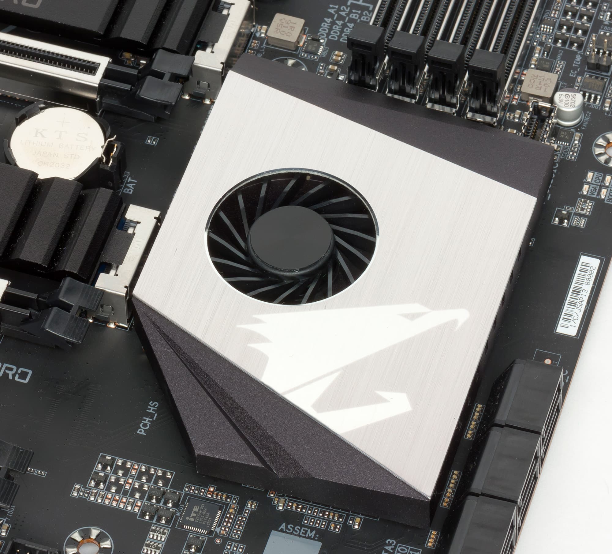 Скорость вращения последнего регулируется платой автоматически широтно-импульсной модуляцией (в BIOS можно настроить и самому). В нагрузке такая система охлаждения удерживает температуру чипсета в пределах 45 °C и совершенно не шумит. Максимальную скорость данный вентилятор развивает лишь при запуске системы и всего на пару секунд. По информации производителя, подшипник вентилятора должен прослужить не менее 60 тысяч часов.