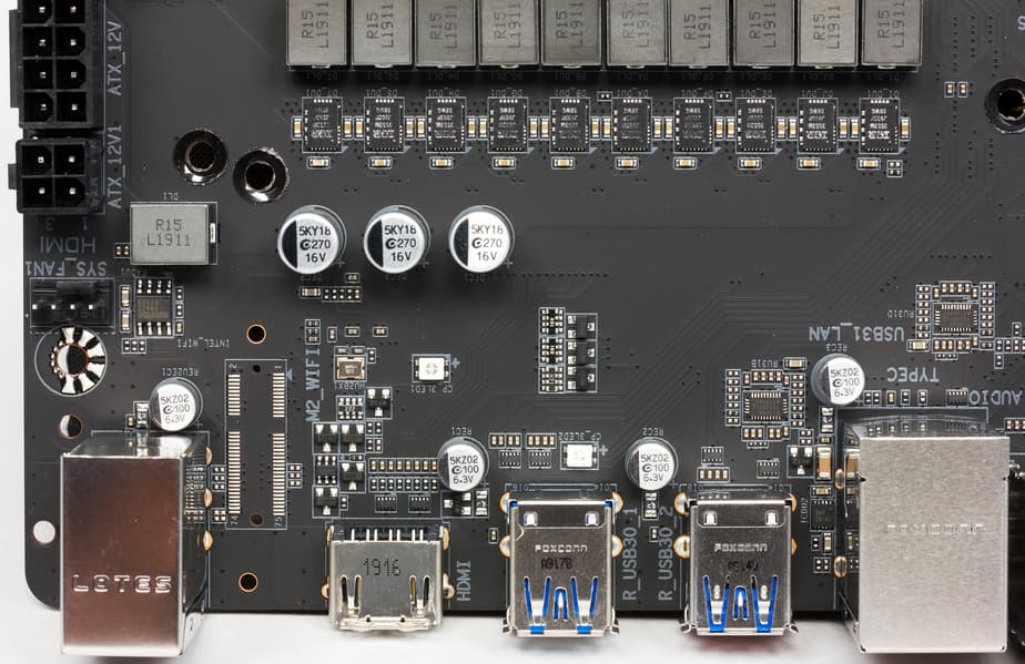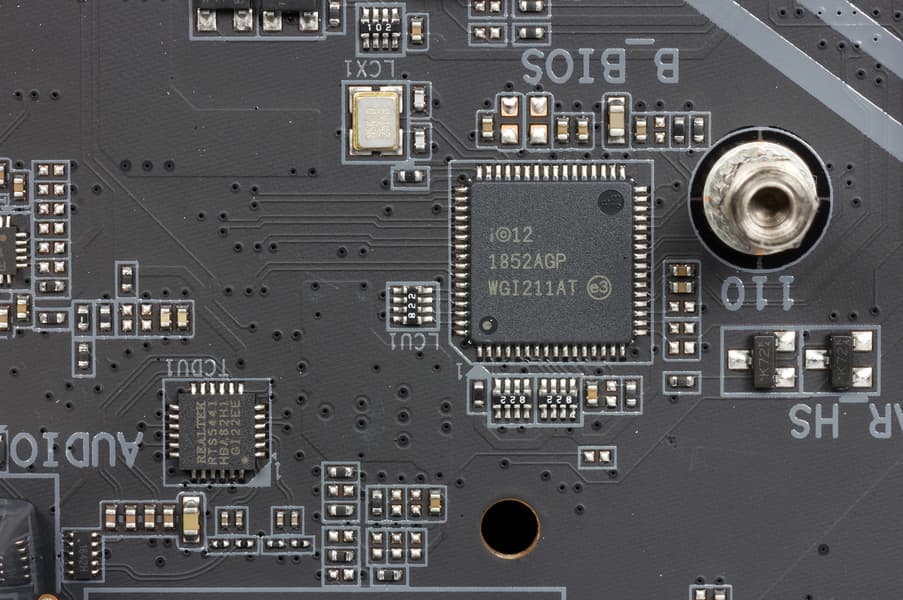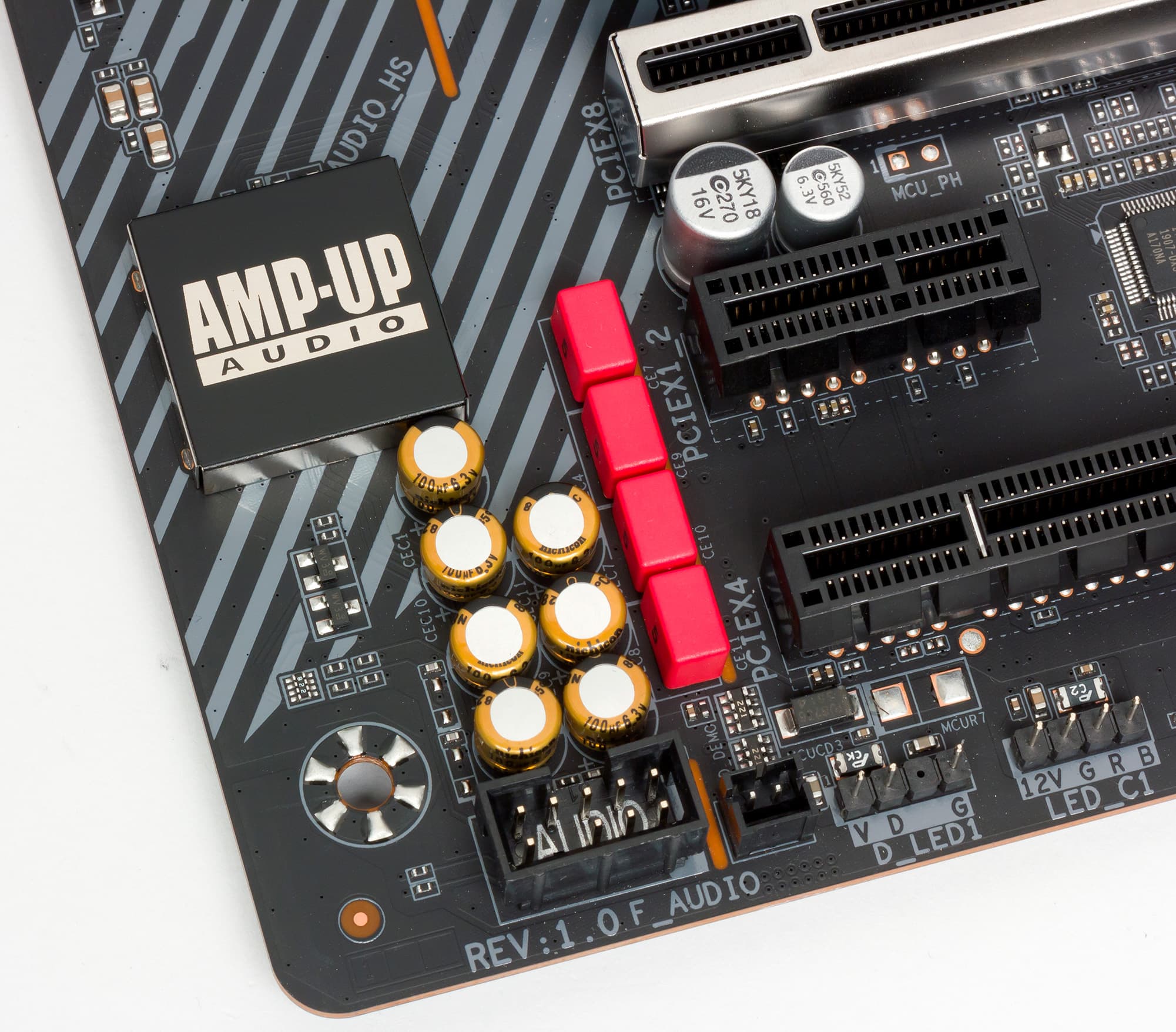 Плата оснащается весьма достойным звуковым кодеком Realtek ALC1220-VB, работающим совместно с интеллектуальным усилителем для наушников, семеркой конденсаторов Nichicon и четверкой конденсаторов Wima FKP2.