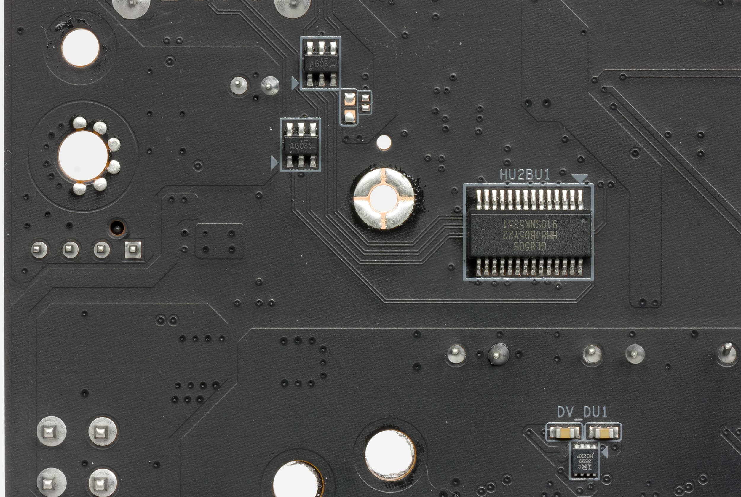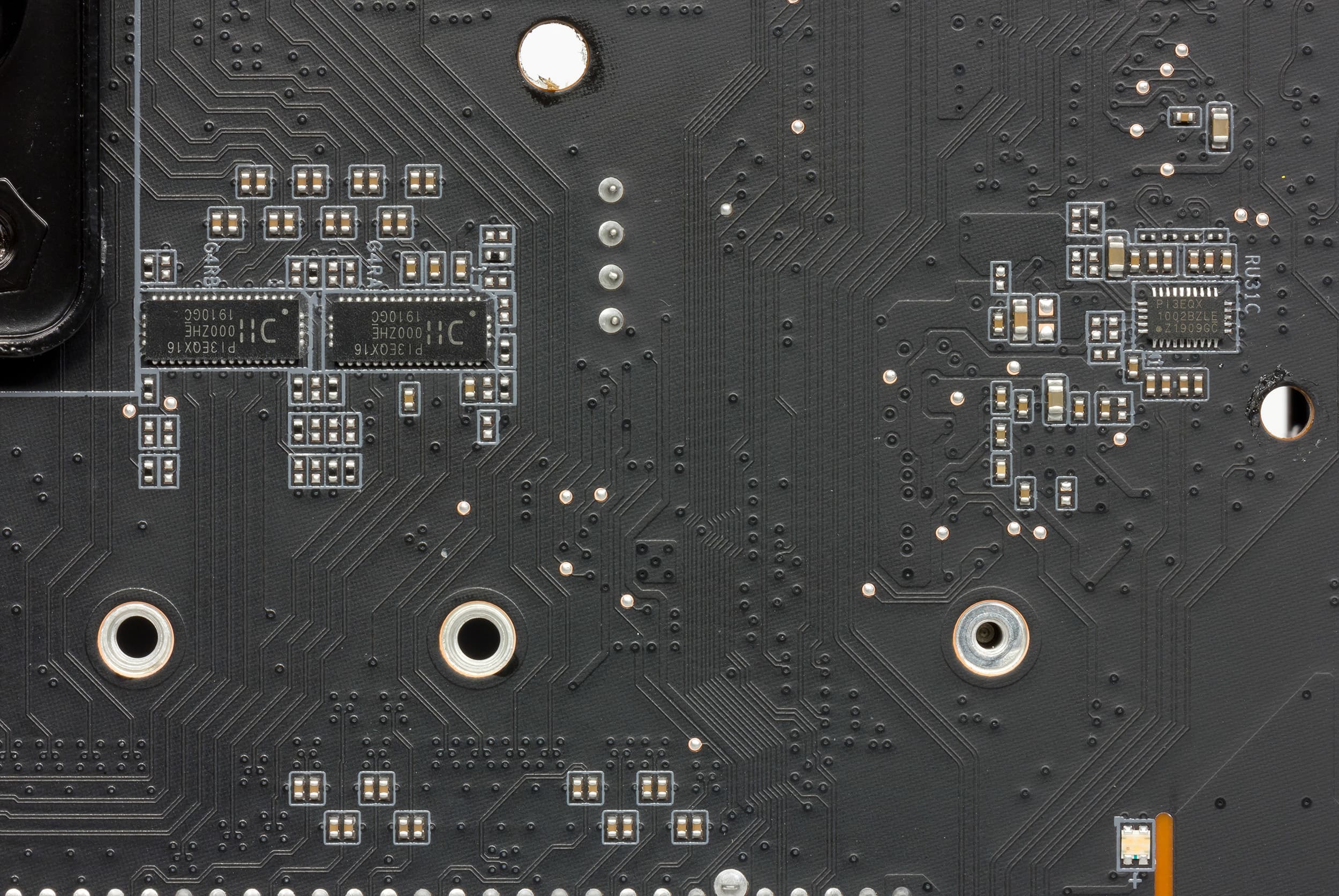 На обратной стороне текстолита в зоне под PCIe-слотами можно найти две микросхемы Pericom PI3EQX16, отвечающие за усиление сигнала для шины PCIe 4.0.
