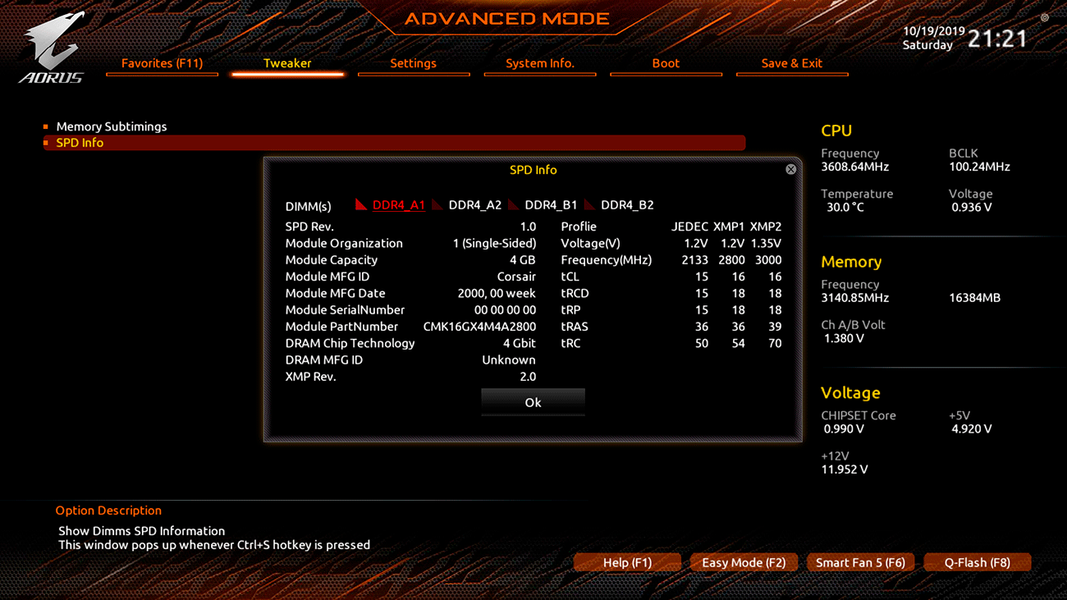 - оперативная память: DDR4 4×4 ГБ Corsair Vengeance LPX 2800 МГц (CMK16GX4M4A2800C16) (XMP 2800 МГц/16-18-18-36_2T/1,2 В или 3000 МГц/16-18-18-36_2T/1,35 В);