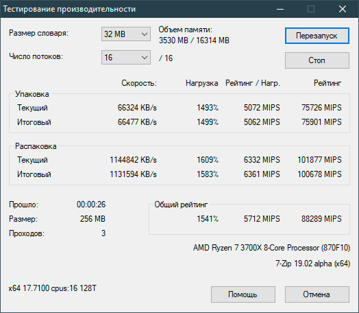 - процессор: AMD Ryzen 7 3700X (Matisse, 7 нм, B0, 3,6 (4,4) ГГц, 8×512 КБ L2, 32 МБ L3, TDP 65 Вт);