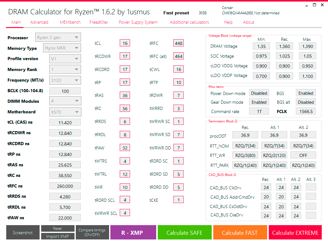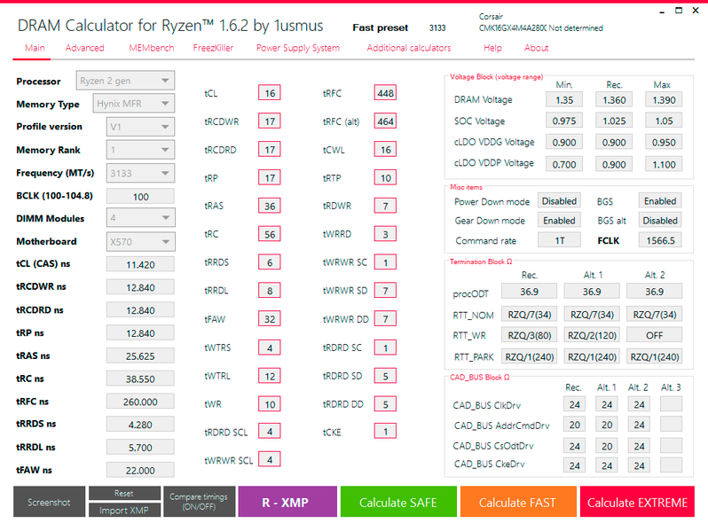 Поскольку дальше процессор разогнать было невозможно, то мы перешли к оперативной памяти. Так как пара Ballistix Sport LT (BLS2K8G4D30AESBK) на Micron E-Die ко мне еще не доехали, приходилось довольствоваться тем, что есть. А есть лишь четверка 4-гигабайтных модулей Corsair Vengeance LPX с номинальной частотой 2,8 ГГц, которые на Gigabyte X570 Aorus Pro смогли работать только на скромной частоте 3,133 ГГц с подбором с помощью DRAM Calculator следующих таймингов.