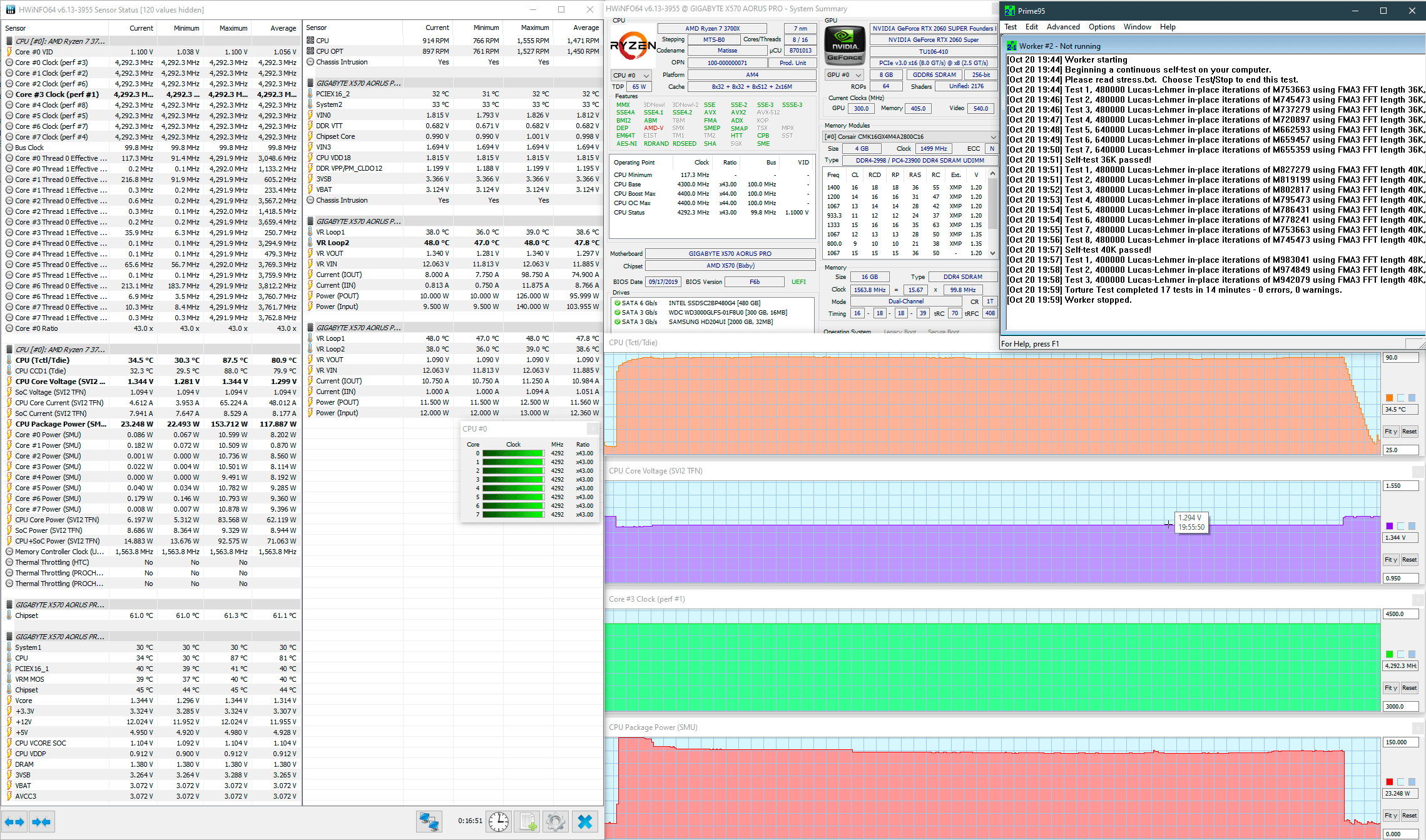 Процессор работал на частотах от 3,47 до 4,39 ГГц при пиковом напряжении 1,450 В, а в нагрузке Prime95 частота процессора варьировалась у отметки 3,94 ГГц, при постоянно скачущем напряжении. При этом максимальная температура процессора не давала повод для волнений и составляла 61 °C, а вентиляторы суперкулера разогнались только до 1370 об/мин.