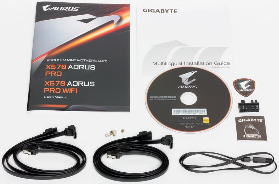 Внутри основной коробки на верхнем поддоне лежит материнская плата, запечатанная в антистатический пакет, а под ней находятся два отсека с комплектующими. В числе последних четыре SATA-кабеля, кабель для RGB-подсветки, наклейка с логотипом Aorus, колодка G Connector для удобного подключения кабелей передней панели корпуса к плате, винты для закрепления M.2-накопителей, диск с драйверами и инструкция.