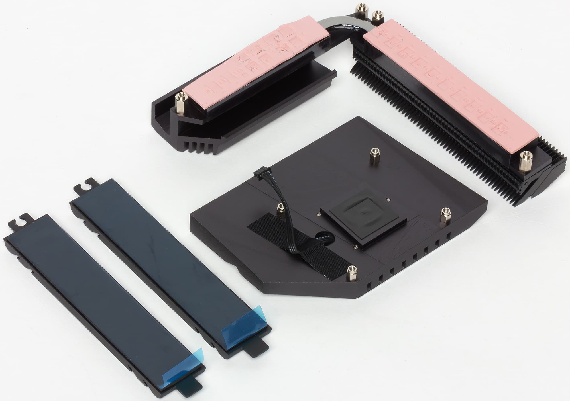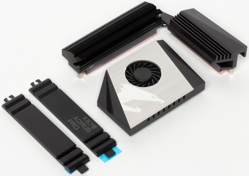 Система охлаждения Gigabyte X570 Aorus Pro реализована соединенным тепловой трубкой двухсекционным радиатором VRM, радиатором чипсета с вентилятором и парой пластин-радиаторов для накопителей в портах M.2.