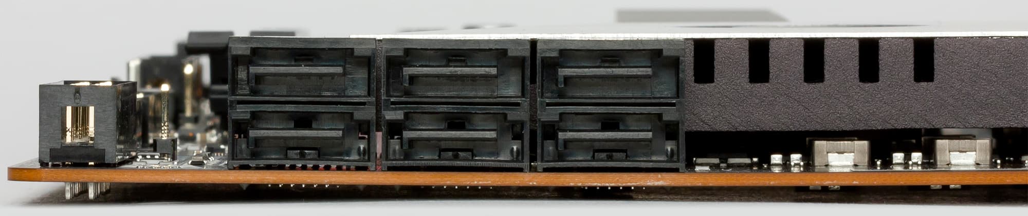 Для накопителей плата имеет четыре порта SATA с пропускной способностью до 6 Гбит/с, реализованные возможностями чипсета AMD X570. Ими поддерживается создание массивов RAID уровней 0, 1 и 10.
