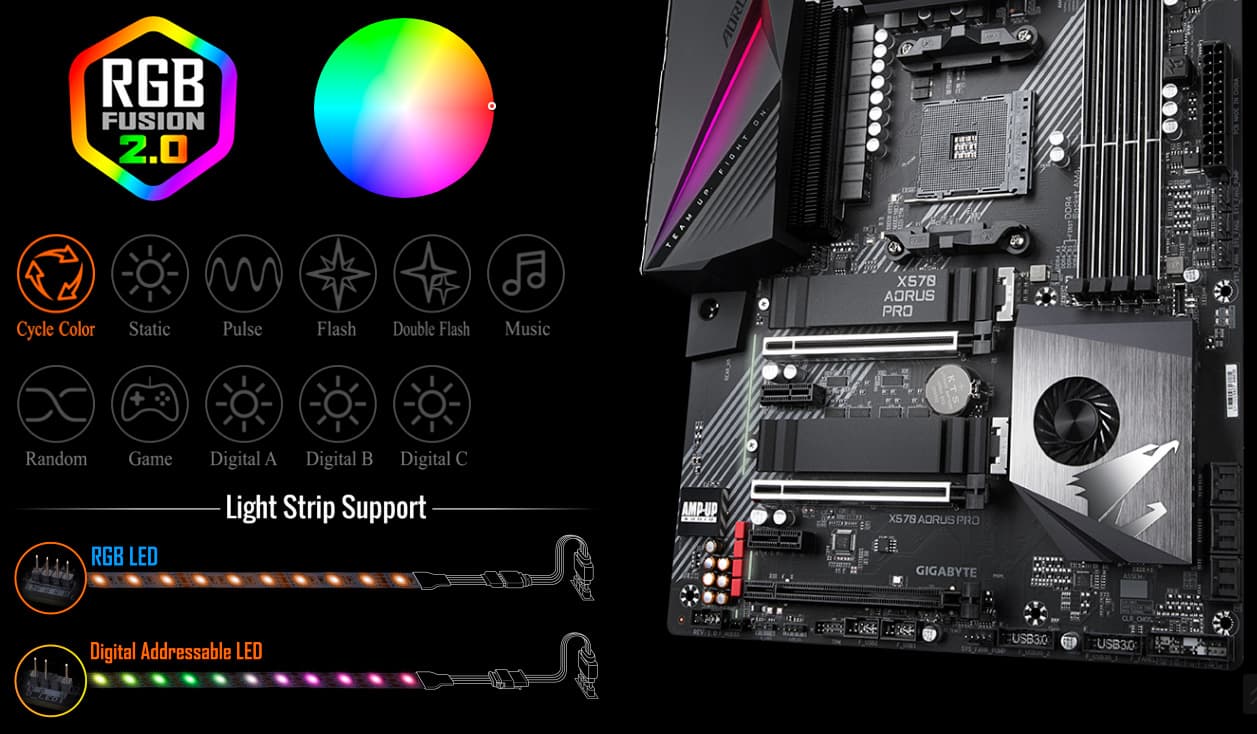 Подсветка у Gigabyte X570 Aorus Pro есть только на пластиковом кожухе панели ввода-вывода и в зоне аудиотракта, а дополнительно к плате можно подключить две светодиодные ленты: одну с адресацией, а другую — без нее.