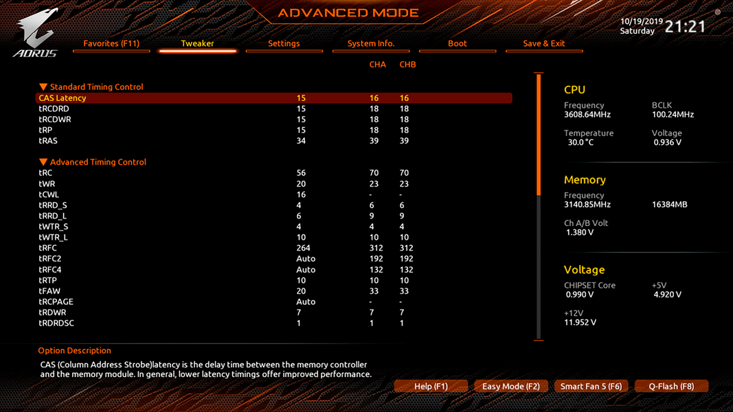 Далее с помощью максимально широких возможностей Gigabyte X570 Aorus Pro по настройке памяти нам удалось снизить основные тайминги до 16-15-15-34 CR1 и скорректировать tFAW на 24, а также уменьшить tRFC с 448 до 264. Такая минимальная настройка оперативной памяти позволила повысить производительность системы в номинальном режиме ее работы на 5%-6%. Сколько прибавила Gigabyte X570 Aorus Pro при одновременном разгоне процессора и оперативной памяти, мы узнаем из следующего раздела статьи.