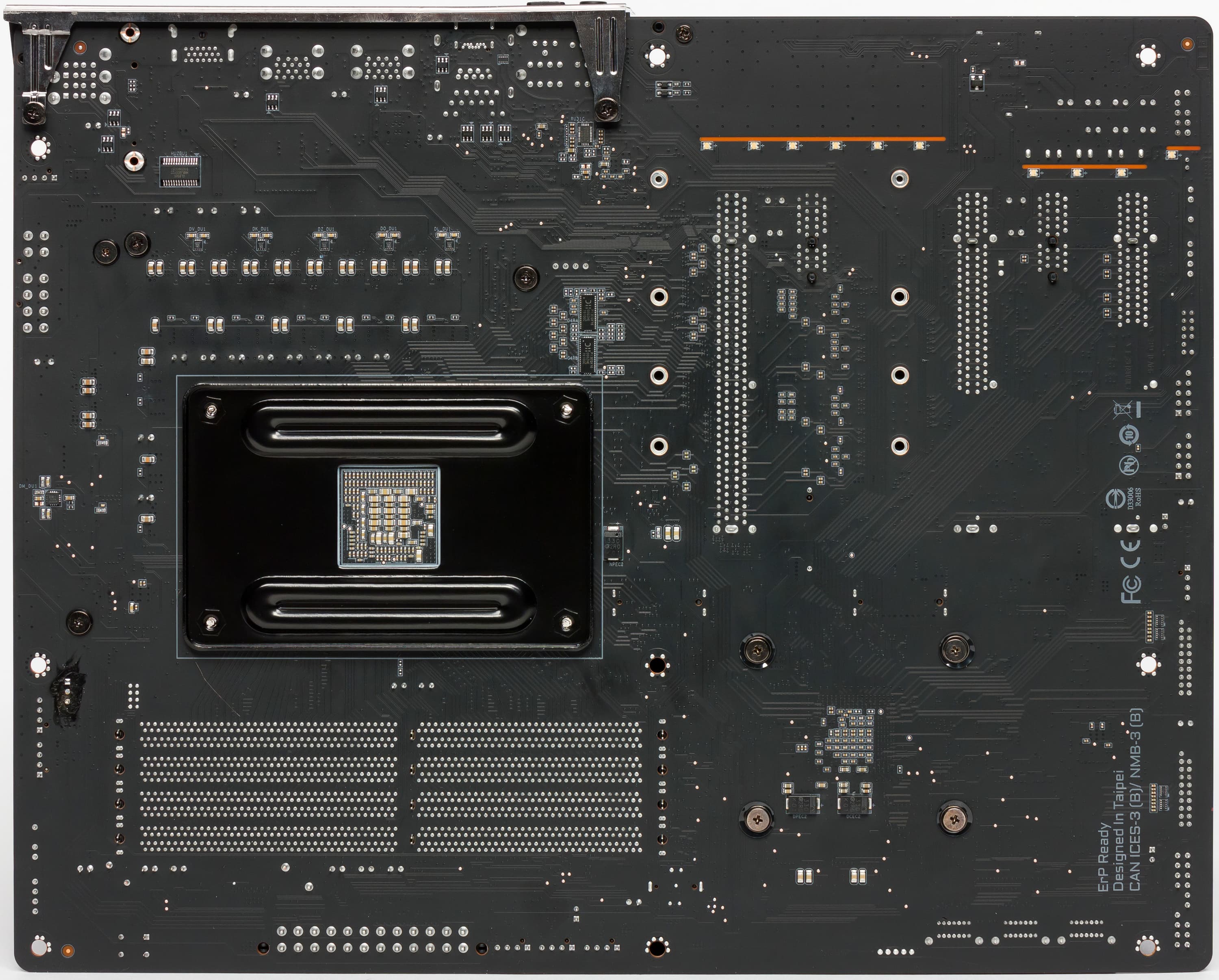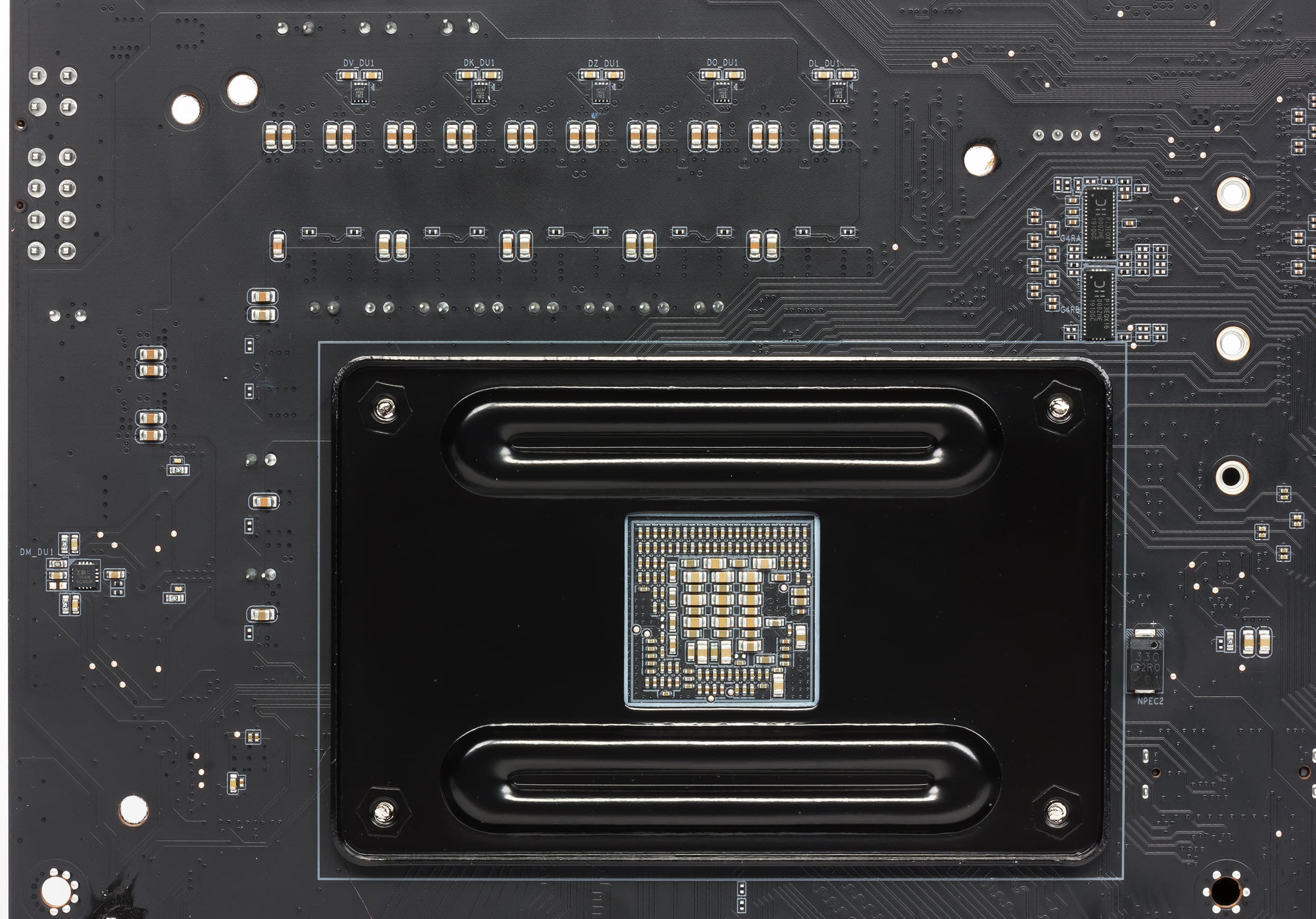 Без всех навесных элементов и радиаторов цепей VRM плата становится непривычно легкой. Обращает на себя внимание безупречное качество пайки, точное и аккуратное расположение всех элементов, вполне закономерно присущее продуктам бренда первого эшелона.