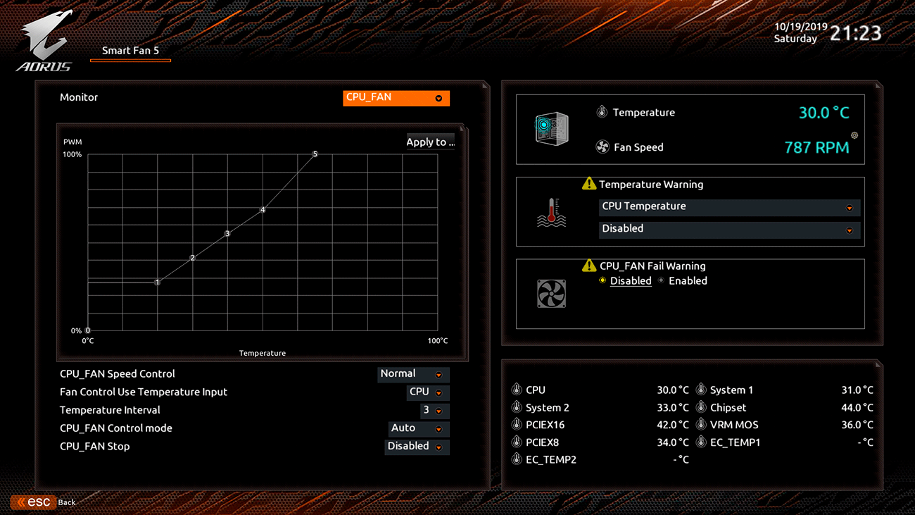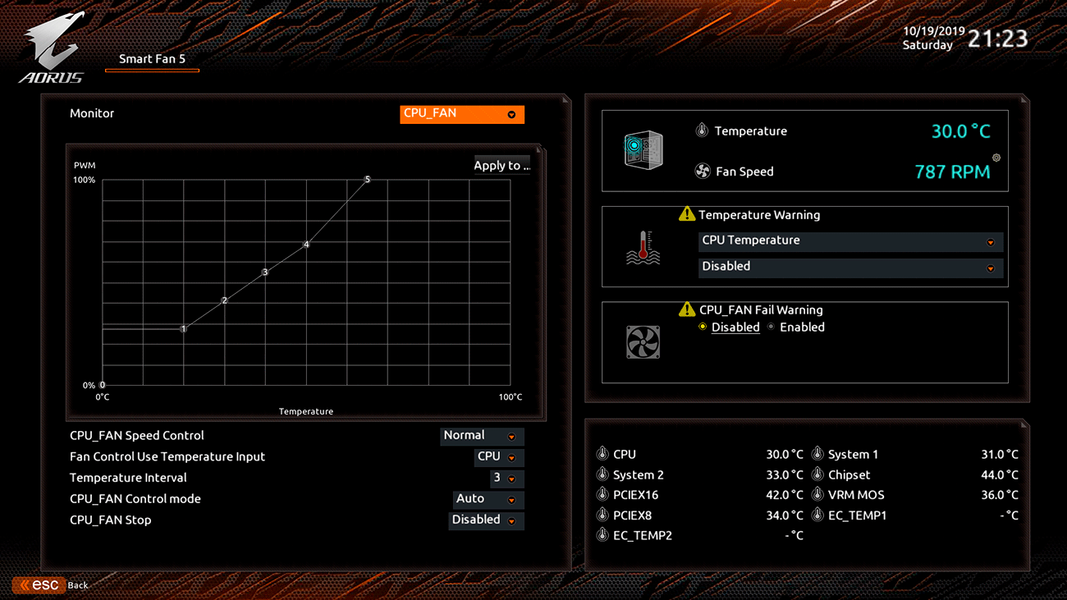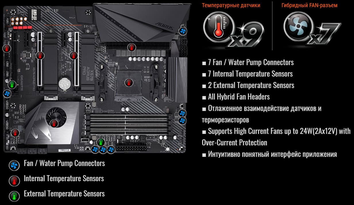 Gigabyte X570 Aorus Pro способна мониторить девять термодатчиков (включая два внешних) и управлять семью подключенными к плате вентиляторами по ШИМ-каналу или напряжением.