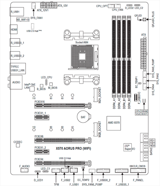 | Разъемы для накопителей | 6×SATA 6 Гбит/с (поддержка дисковых массивов RAID 0, RAID 1, и RAID 10) 1×M.2A (CPU, PCIe 4.0/3.0 x4/x2 или SATA для устройств формата 2242/2260/2280/22110) 1×M.2B (X570, PCIe 4.0/3.0 x4/x2 или SATA для устройств формата 2242/2260/2280/22110) |
