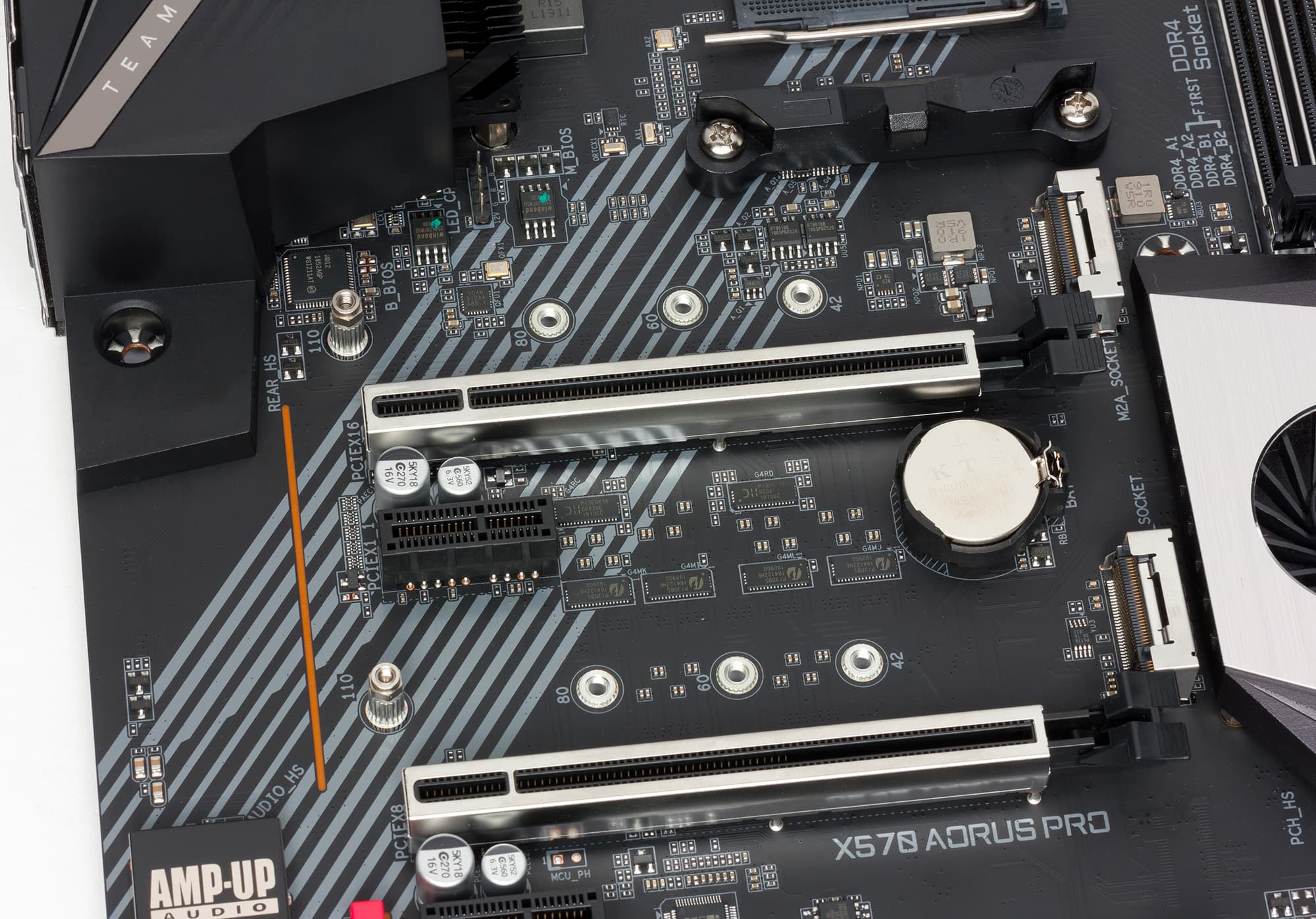 Основной слот PCI Express на Gigabyte X570 Aorus Pro подключен к процессору и поддерживает работу в режиме 4.0 с процессорами AMD Ryzen третьего поколения и в режиме 3.0 х16 с AMD Ryzen второго поколения.