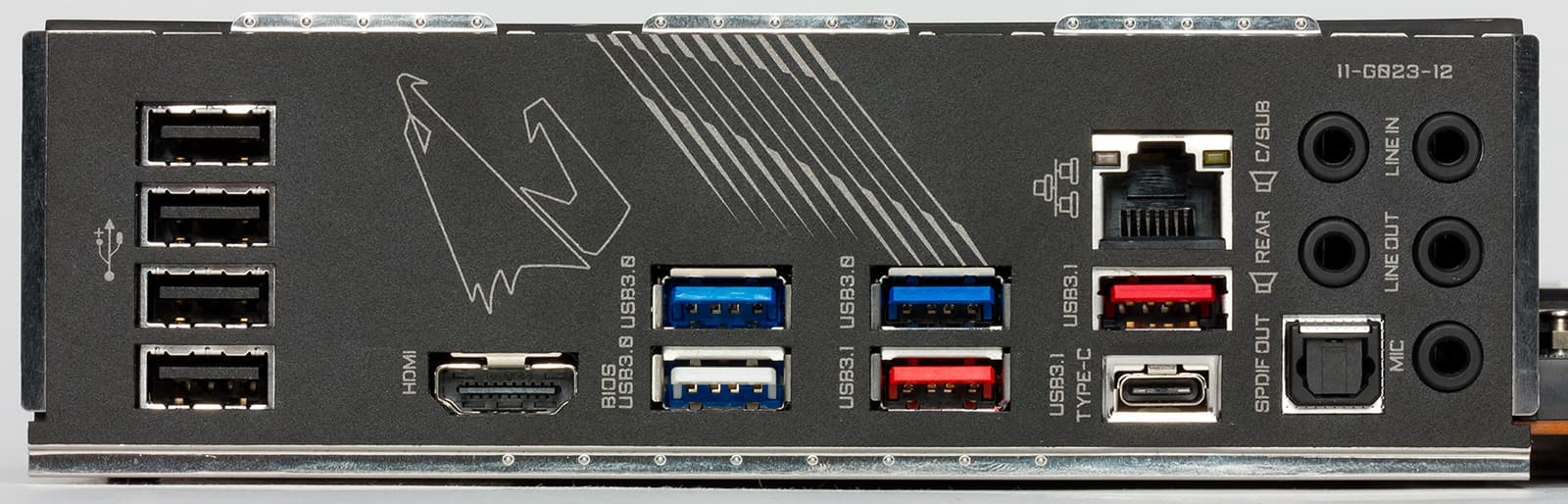 На панели ввода/вывода можно отметить большое количество USB-портов, из которых три высокоскоростных USB 3.2 Gen2, три USB 3.2 Gen1 и четыре USB 2.0/1.1. Кроме этого, на ней можно найти видеовыход HDMI, сетевую розетку RJ-45, оптический выход и пять аудиоразъемов типа миниджек.