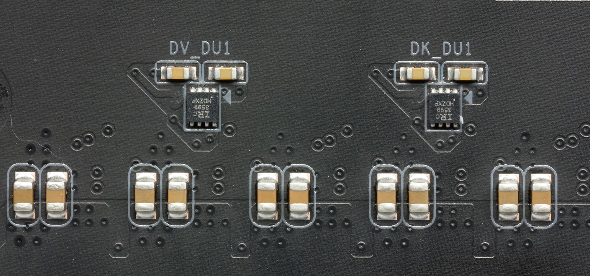 Правда, дублеры Infineon IR3599 на обратной стороне текстолита выдают шесть честных, но удвоенных фаз.