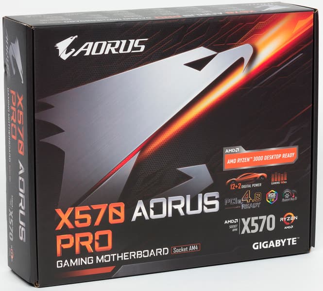 Gigabyte X570 Aorus Pro поставляется в большой коробке, оформленной в привычном для компании стиле. На лицевой стороне коробки указана поддержка процессоров AMD Ryzen 3000-й серии и краткие технические характеристики.