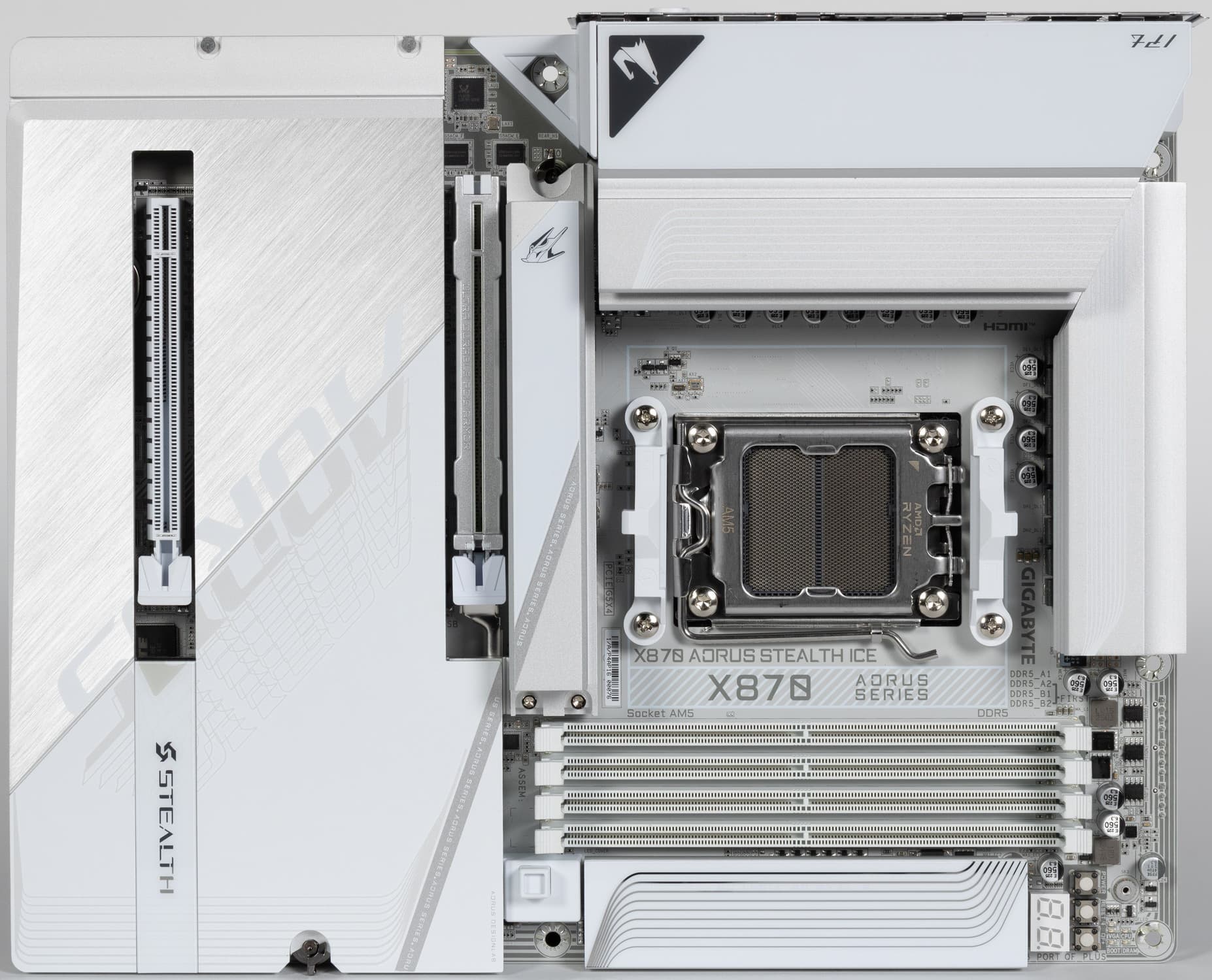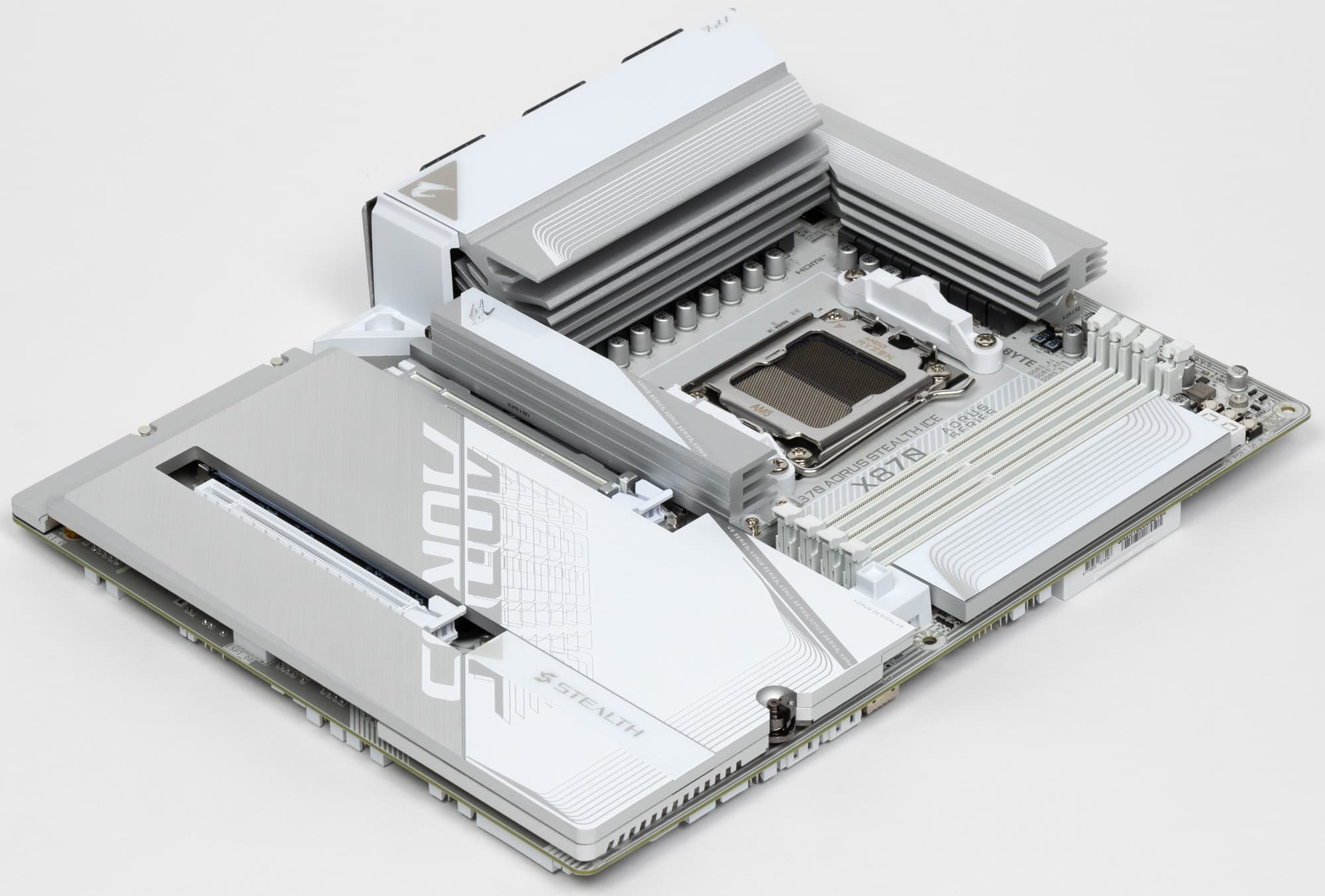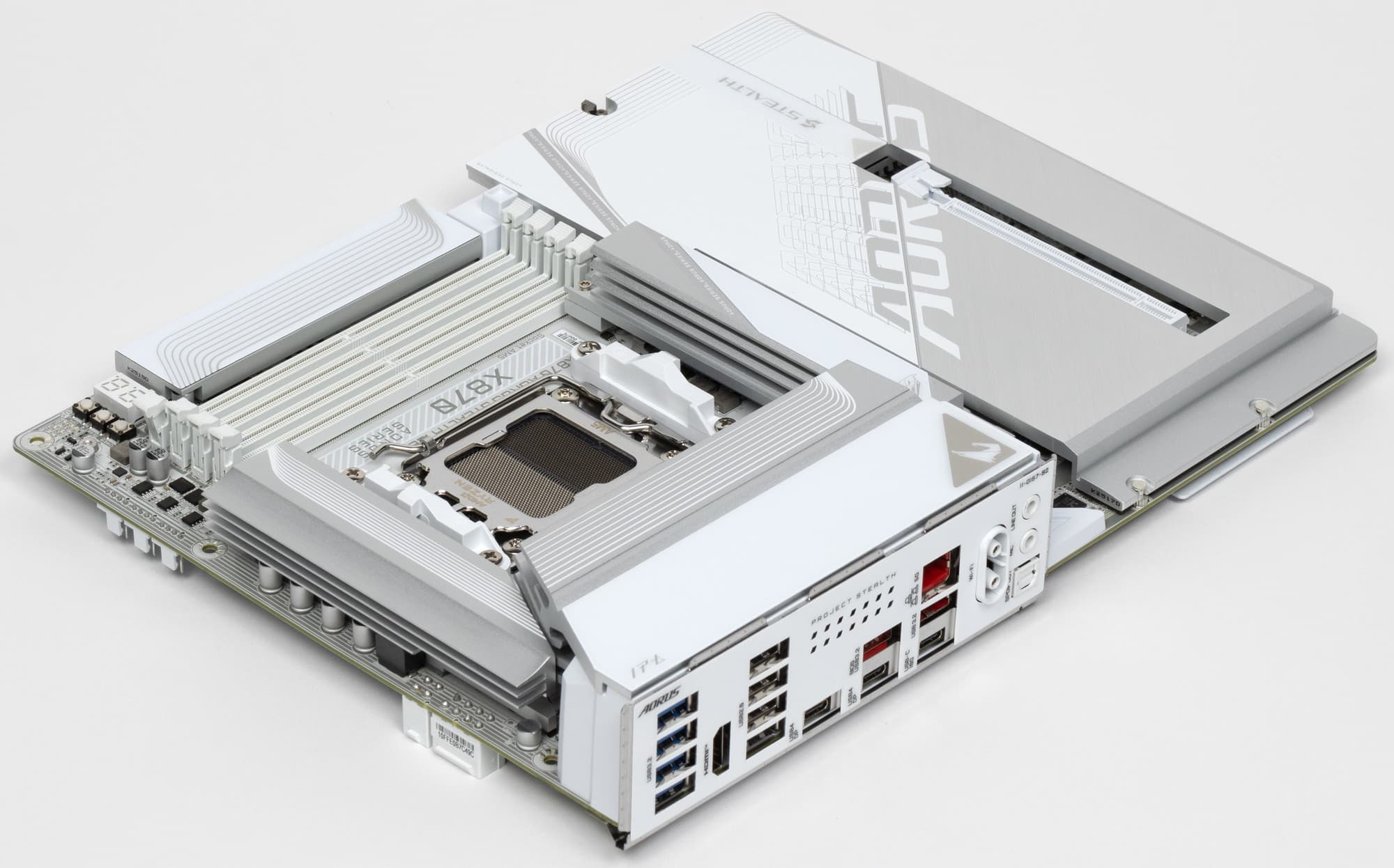 Общеизвестно, что у Gigabyte кроме собственного бренда есть суббренд Aorus, в который компания относит все самые навороченные и флагманские продукты. Вот наша сегодняшняя плата относится к этой серии — Gigabyte X870 Aorus Stealth Ice, базируемая на AMD X870. Плата относится к серии Stealth, которая подразумевает оборотное расположение всех основных контактов и гнезд.
