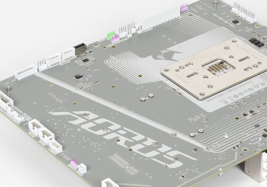 Материнская плата Gigabyte X870 Aorus Stealth Ice — модель достаточно высокого уровня на чипсете AMD X870, ее стоимость ожидается в пределах 45-50 тысяч рублей (на момент публикации обзора продажи еще не начались). Она поддерживает процессоры AMD Ryzen 7000/8000/9000 и создана для геймеров и продвинутых пользователей. Плата уникальна тем, что большинство разъемов у нее вынесены на тыльную сторону текстолита, а на лицевой остались лишь процессорный сокет, слоты памяти, PCIe и M.2. Это дает возможность оставлять все требуемые кабели с задней стороны корпуса, освободив от них видимую переднюю часть. В результате получается красивый ПК белого цвета без торчащих кабелей, но корпус нужен специальный, с вырезами для разъемов платы в монтировочной пластине.