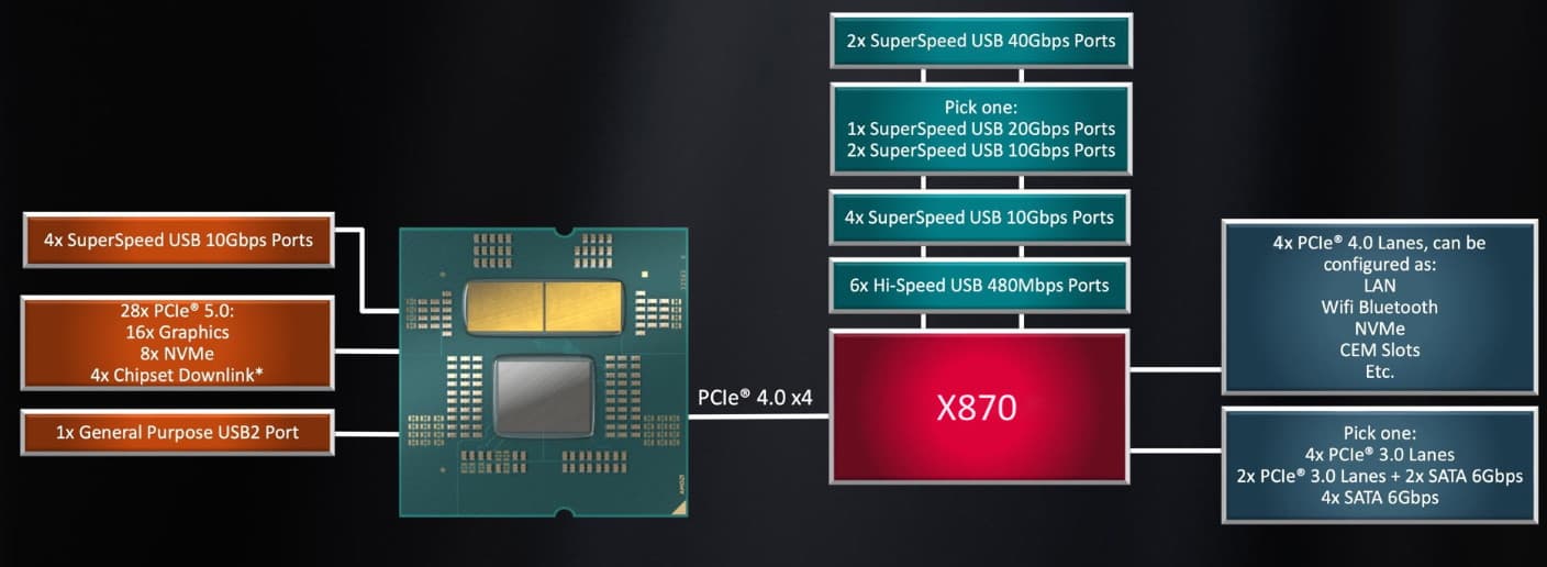Напомню, что чипсет X870 имеет тот же набор портов и линий PCIe, что и B650E, плюс поддержка 2х портов USB4 (через сторонний контроллер).