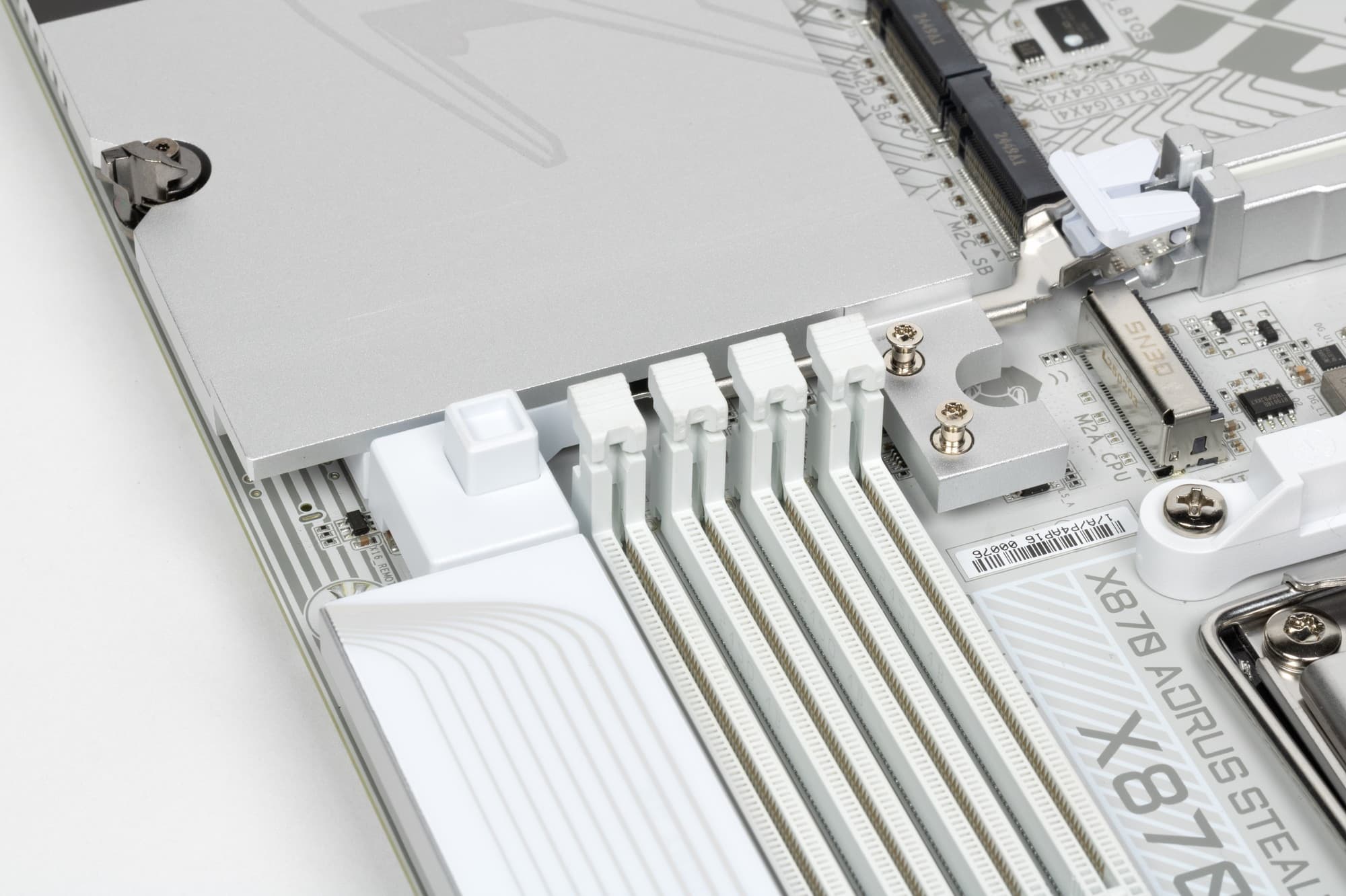 Для установки модулей памяти на плате имеется четыре DIMM-слота (для работы памяти в Dual Channel в случае использования всего 2 модулей их следует устанавливать в А2 и B2). Плата поддерживает небуферизованную память DDR5, а максимальный объем памяти составляет 256 ГБ. Поддерживаются профили XMP и Expo.