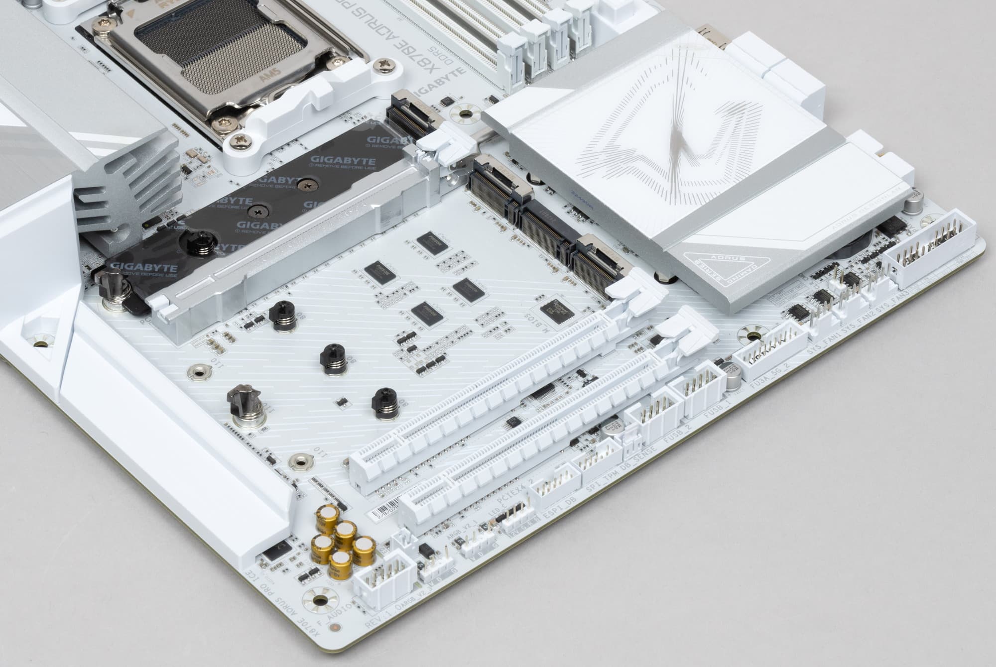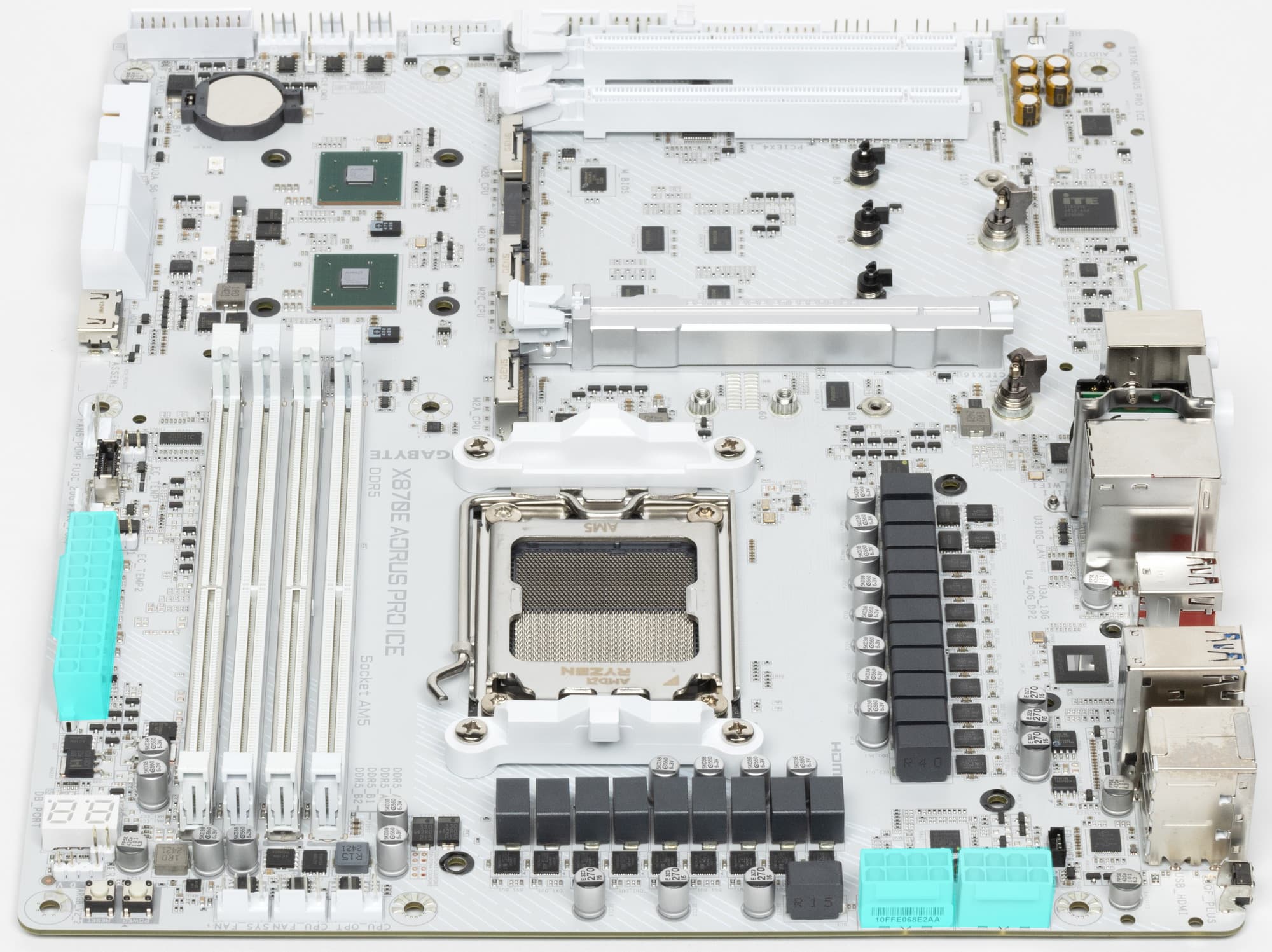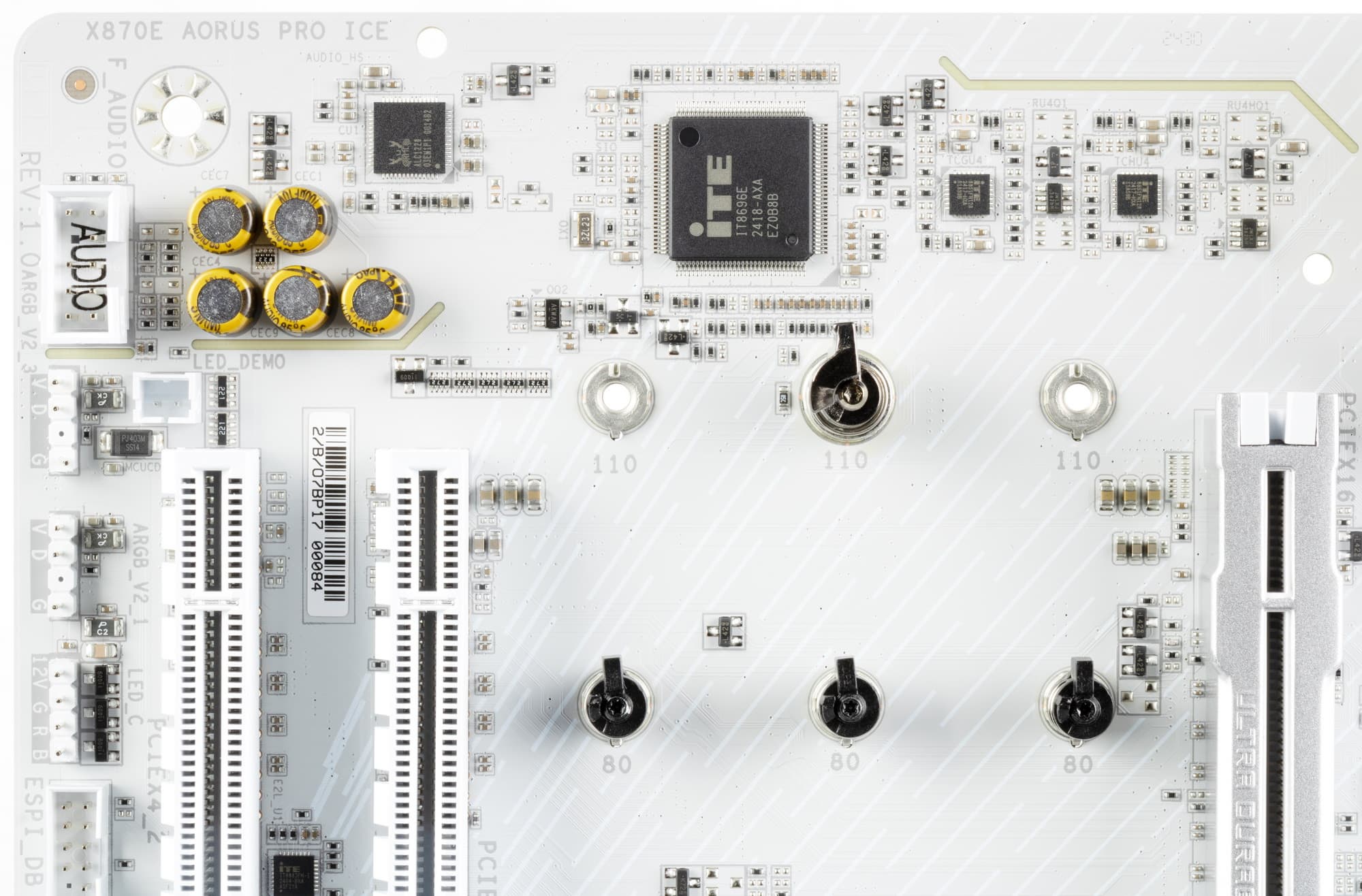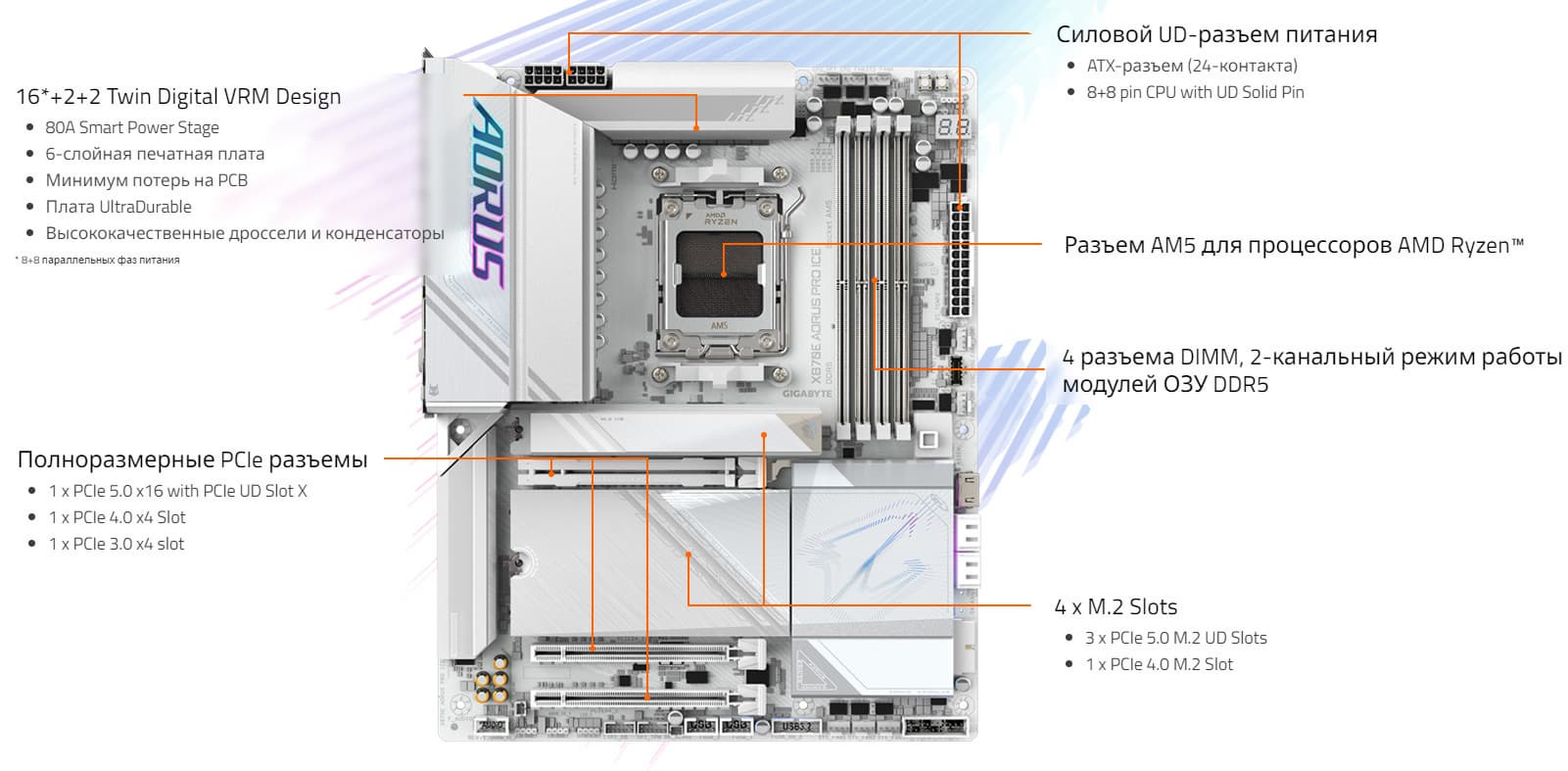 У Gigabyte X870E Aorus Pro Ice имеется 20 портов USB разных видов, включая 2 самых современных USB4 (40 Гбит/с), 11 USB 3.2 Gen1/2, а также USB 3.2 Gen2×2 в виде внутреннего порта Type-C. Плата предлагает 1 слот PCIe х16, который получает от процессора 16 линий PCIe версии 5.0 (и делит их с двумя слотами M.2, подключенными к процессору), также имеется 2 слота формата PCIe x16, соединенных с чипсетом 4 линиями PCIe 4.0/3.0. Всего у платы 4 слота M.2: три из них подключены напрямую к процессору линиями PCIe 5.0, один подключен к чипсету X870E линиями PCIe 4.0. Также в арсенале платы есть 4 порта SATA и 8 разъемов для вентиляторов. Система питания процессора очень мощная, она способна обеспечить работу любых совместимых процессоров с приличным запасом на разгон. Плата имеет грамотную систему охлаждения каждого потенциально греющегося элемента, включая накопители в слотах M.2.