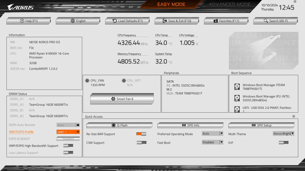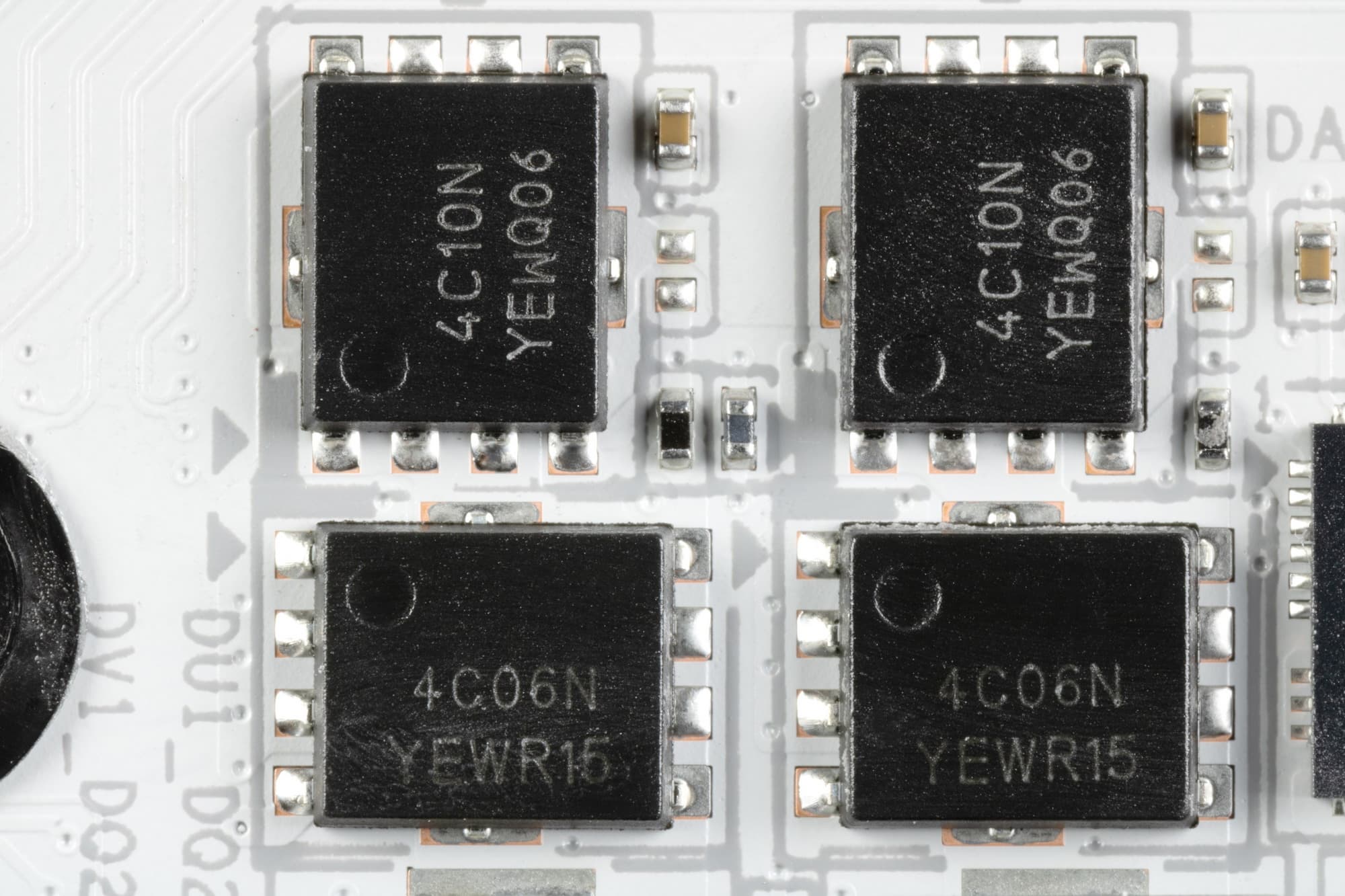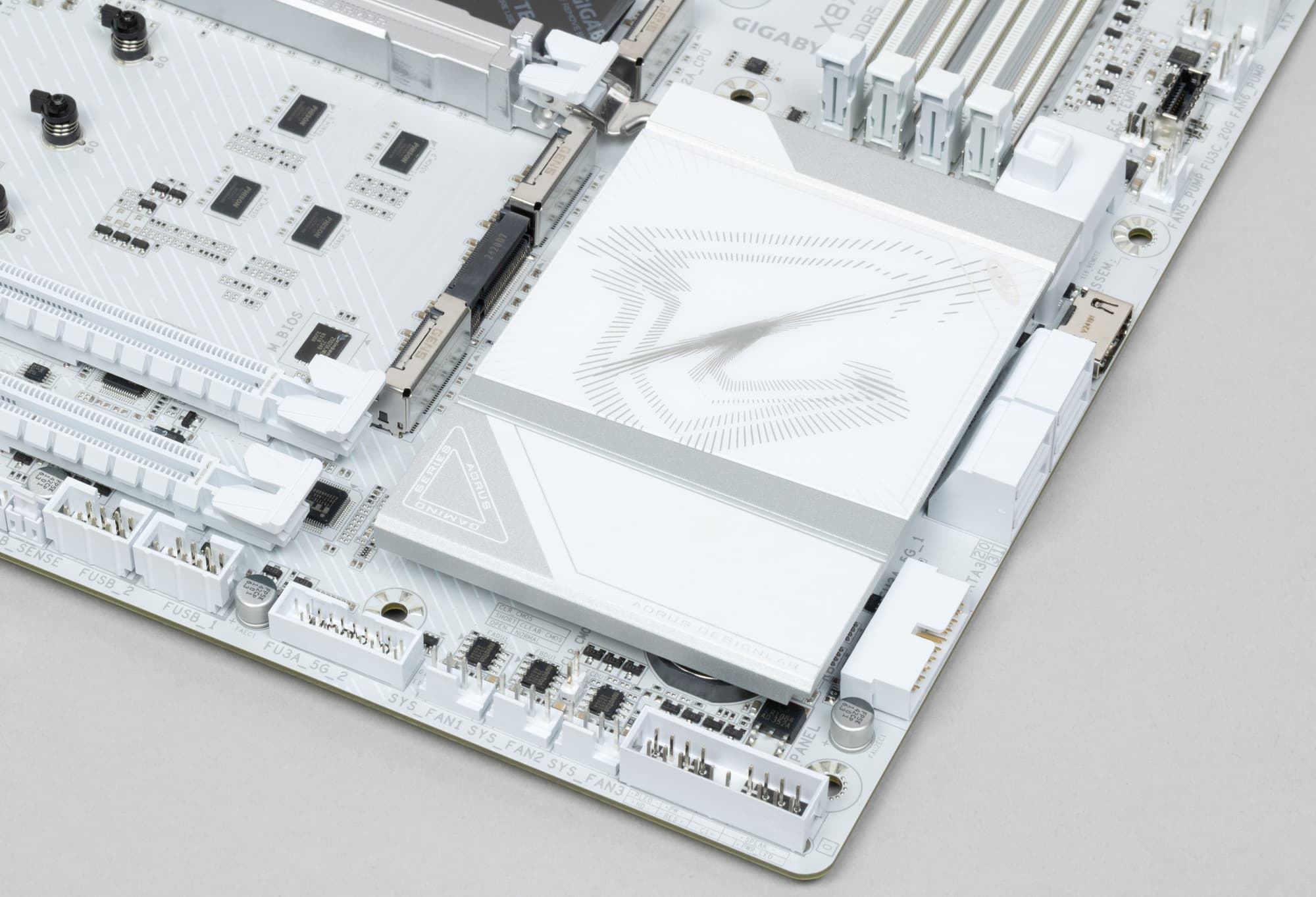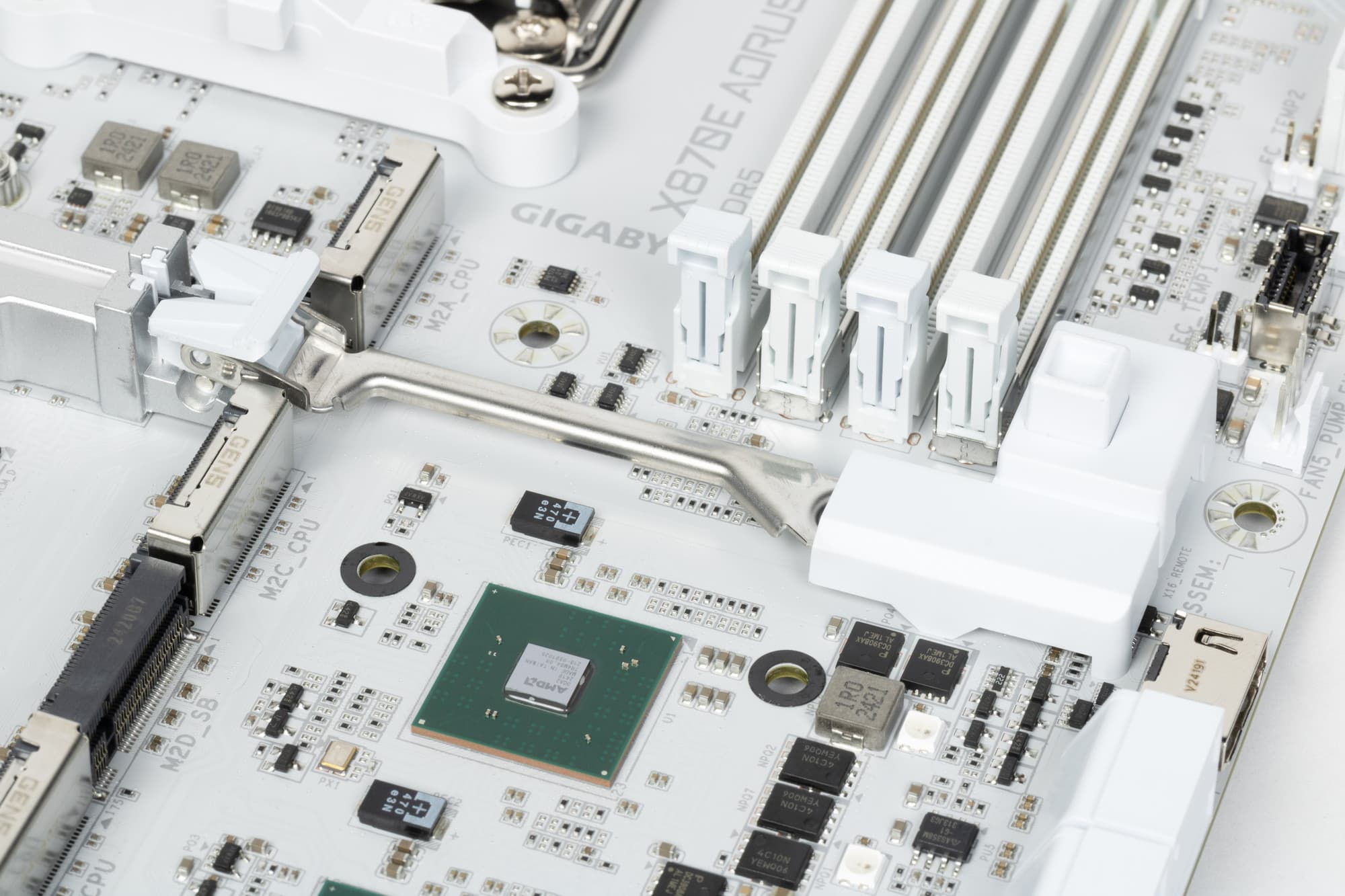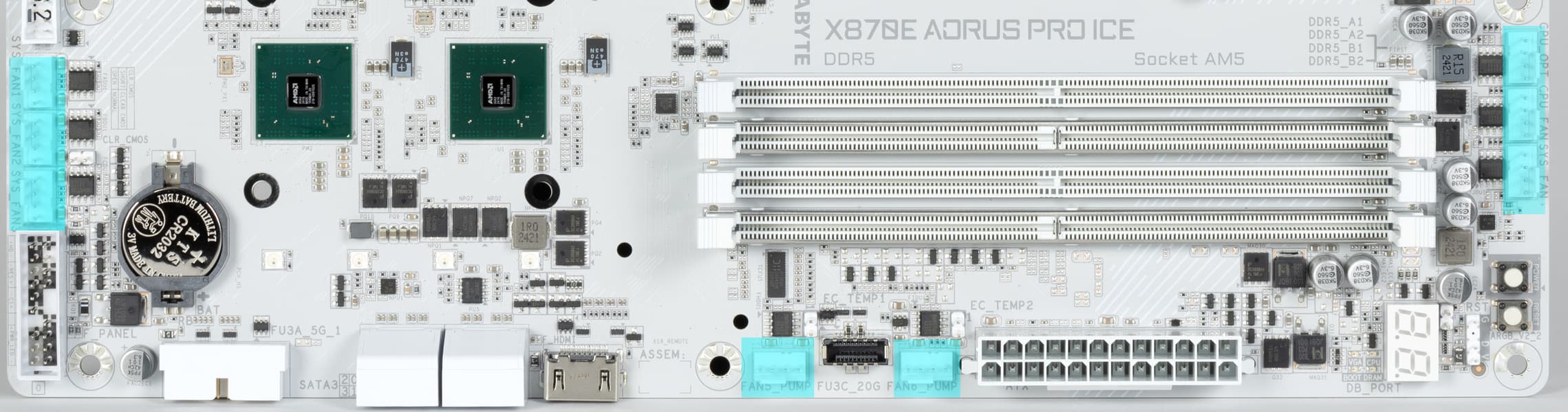У Gigabyte X870E Aorus Pro Ice имеется 20 портов USB разных видов, включая 2 самых современных USB4 (40 Гбит/с), 11 USB 3.2 Gen1/2, а также USB 3.2 Gen2×2 в виде внутреннего порта Type-C. Плата предлагает 1 слот PCIe х16, который получает от процессора 16 линий PCIe версии 5.0 (и делит их с двумя слотами M.2, подключенными к процессору), также имеется 2 слота формата PCIe x16, соединенных с чипсетом 4 линиями PCIe 4.0/3.0. Всего у платы 4 слота M.2: три из них подключены напрямую к процессору линиями PCIe 5.0, один подключен к чипсету X870E линиями PCIe 4.0. Также в арсенале платы есть 4 порта SATA и 8 разъемов для вентиляторов. Система питания процессора очень мощная, она способна обеспечить работу любых совместимых процессоров с приличным запасом на разгон. Плата имеет грамотную систему охлаждения каждого потенциально греющегося элемента, включая накопители в слотах M.2.