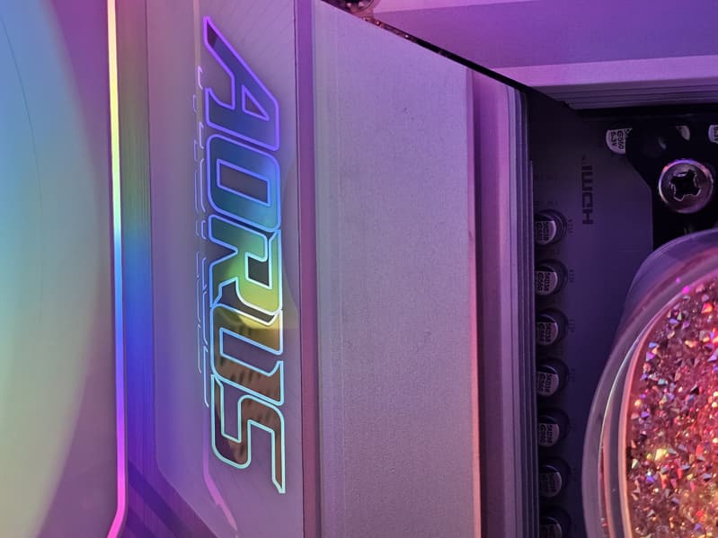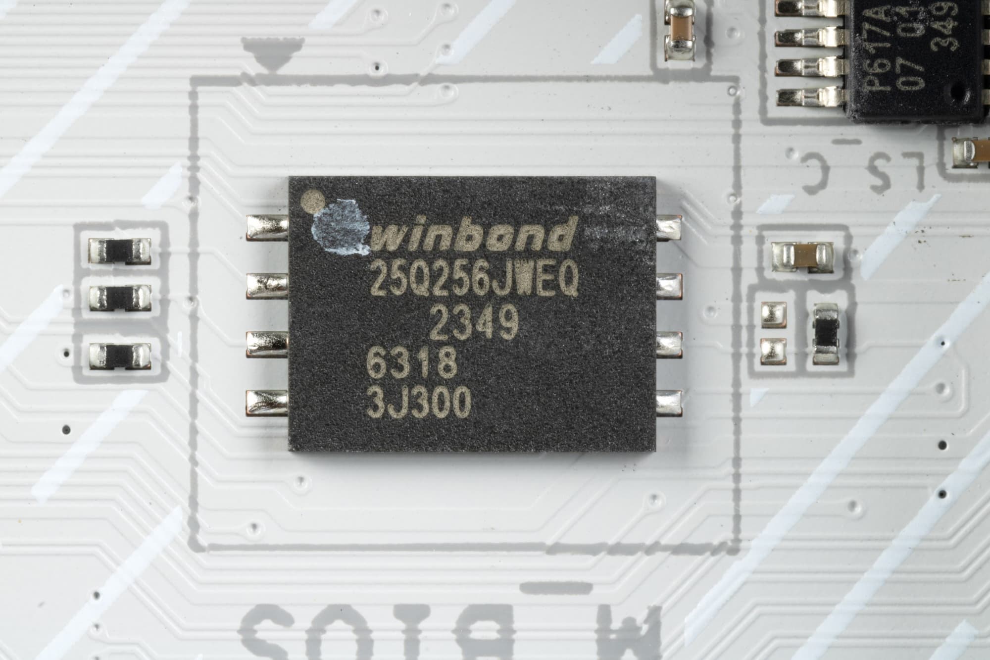 На оборотной стороне расположена металлическая пластина жесткости крепления основного слота PCIe x16 и традиционная некоторая логика. Текстолит обработан хорошо: во всех точках пайки острые концы срезаны,а также отшлифовано. Защитной пластины (бэкплейта) нет. Любопытно отметить, что с оборотной стороны плата покрашена в серый, а не белый цвет, а также видны попытки создания некоего абстрактного рисунка на тему «Я не знаю, что такое Aorus, но я так его вижу».